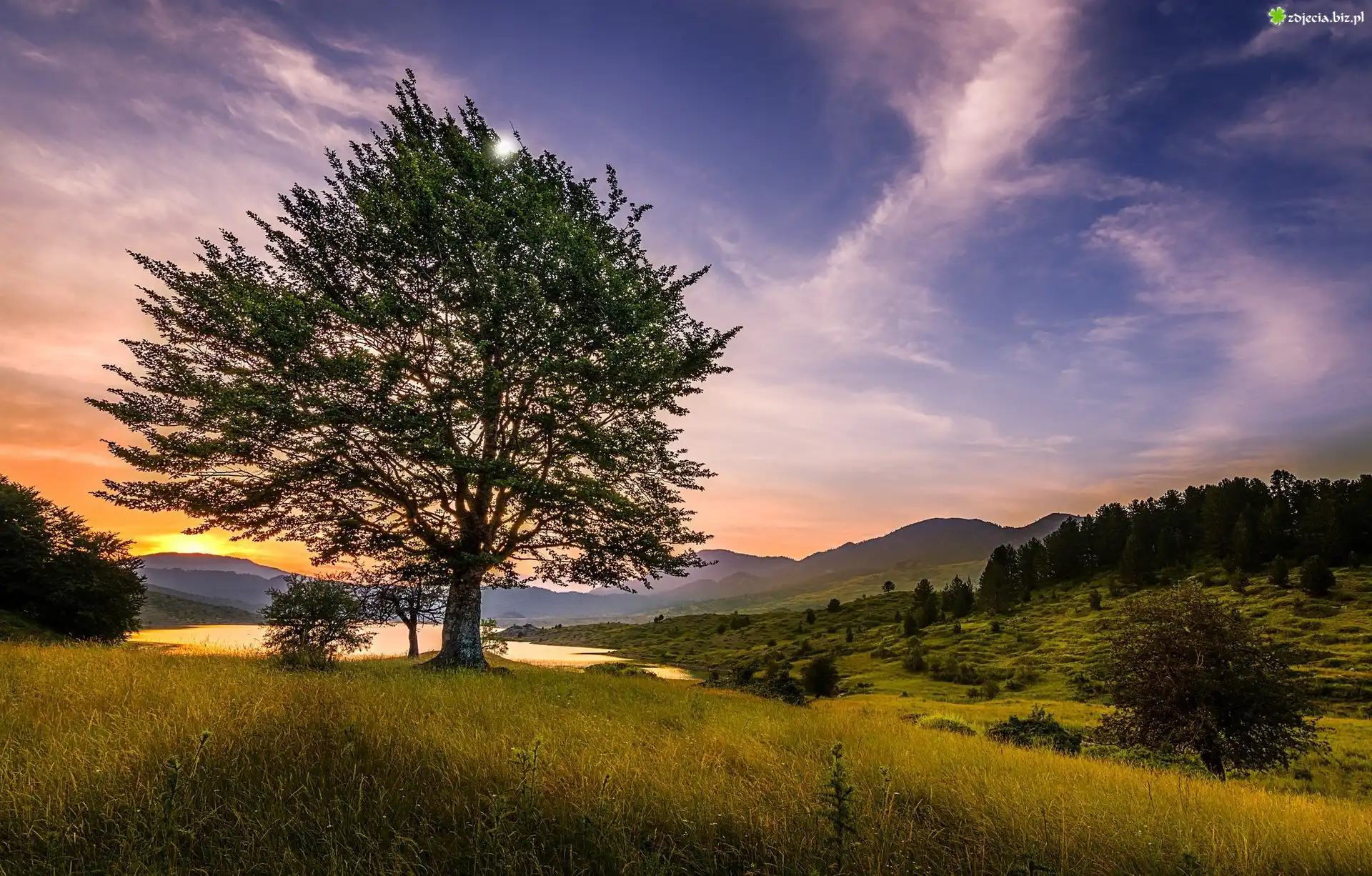 Zdjęcie Pola, Drzewo, Wzgórza, Jezioro