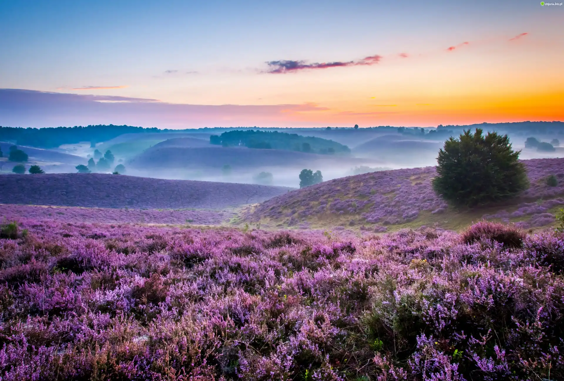 Zdjęcie Wzgórza, Pola, Wrzosy, Drzewa, Mgła, Zachód, Słońca, Wrzosowisko