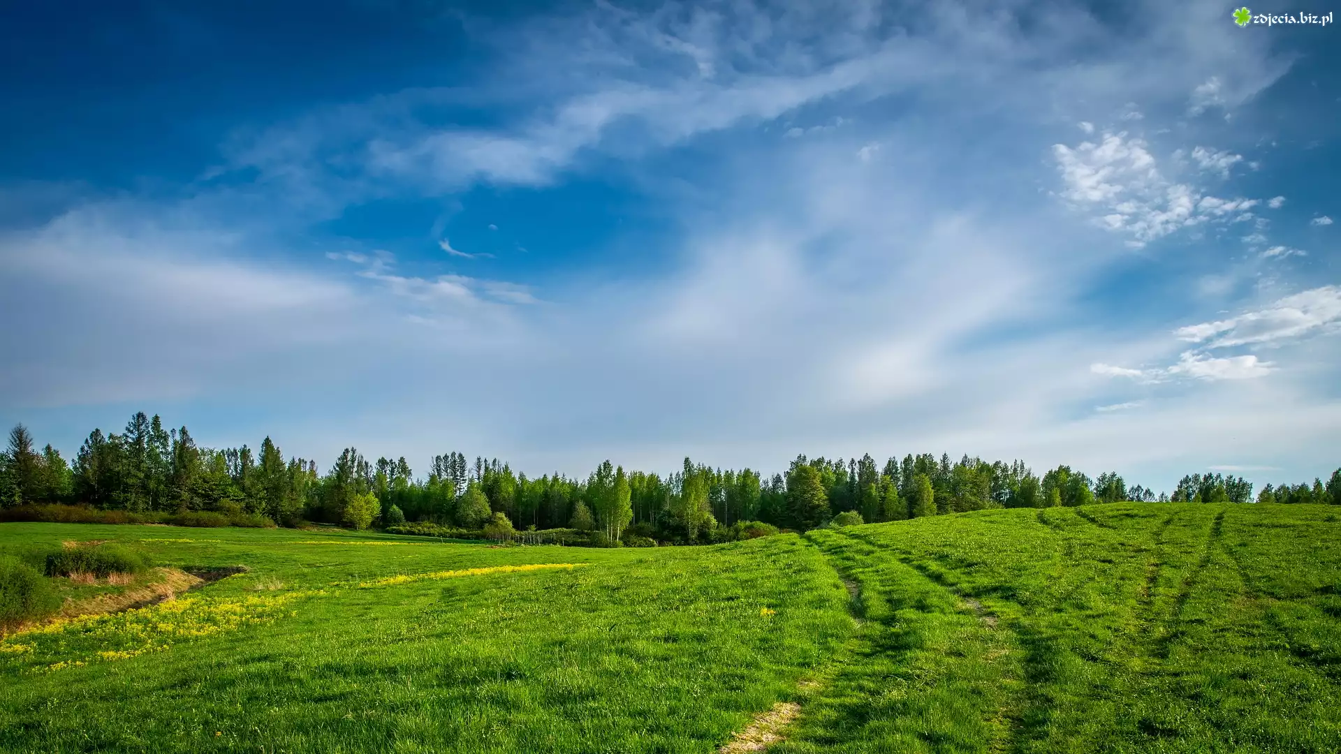 Zdjęcie Pole, Łąka, Zielona, Trawa, Drzewa, Niebo