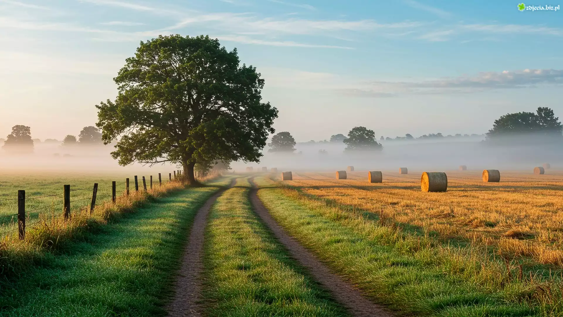 Zdjęcie Jesień, Droga, Drzewo, Pole, Mgła, Bele, Słomy
