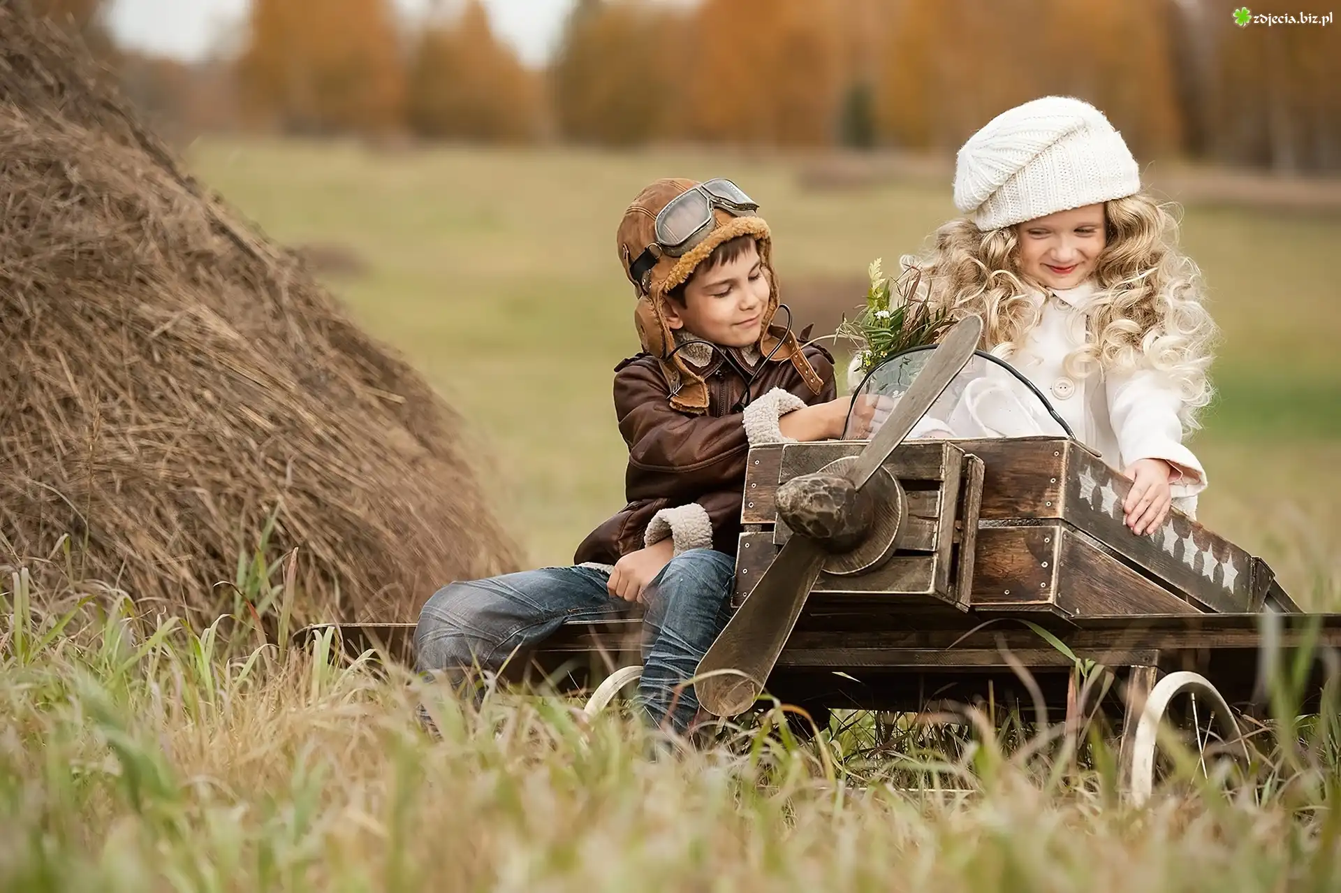 Zdjęcie Dzieci, Pole, Zabawka, Samolot, Pilot, Bukiet, Polnych, Kwiatów