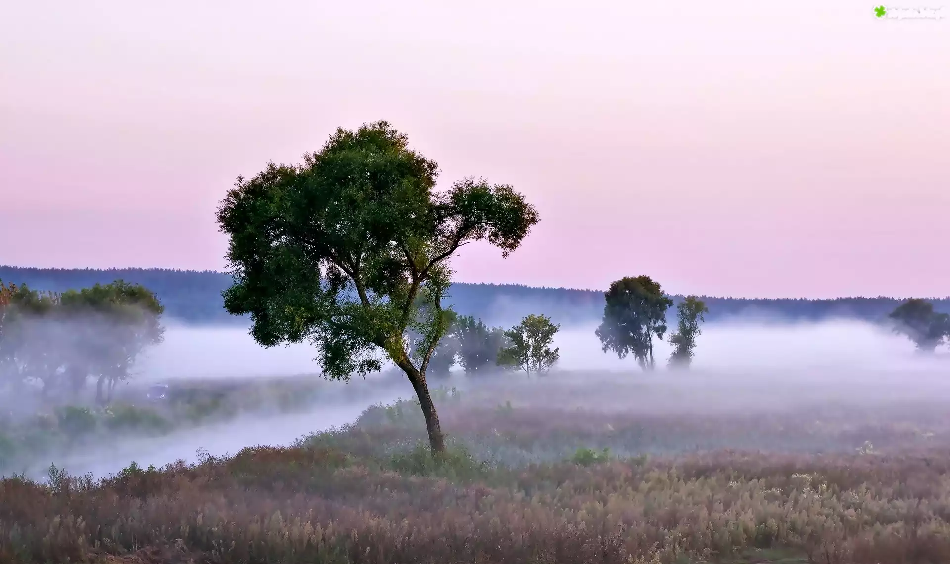 Zdjęcie, Pole, Rzeka, Mgła, Drzewa