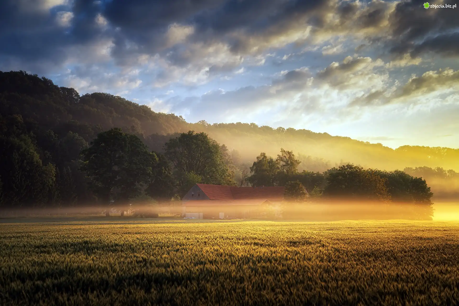 Zdjęcie Pole, Dom, Świt, Mgła, Drzewa