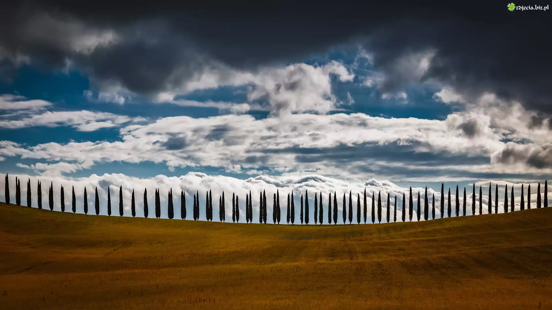 Zdjęcie Pole, Drzewa, Cyprysy, Niebo, Chmury