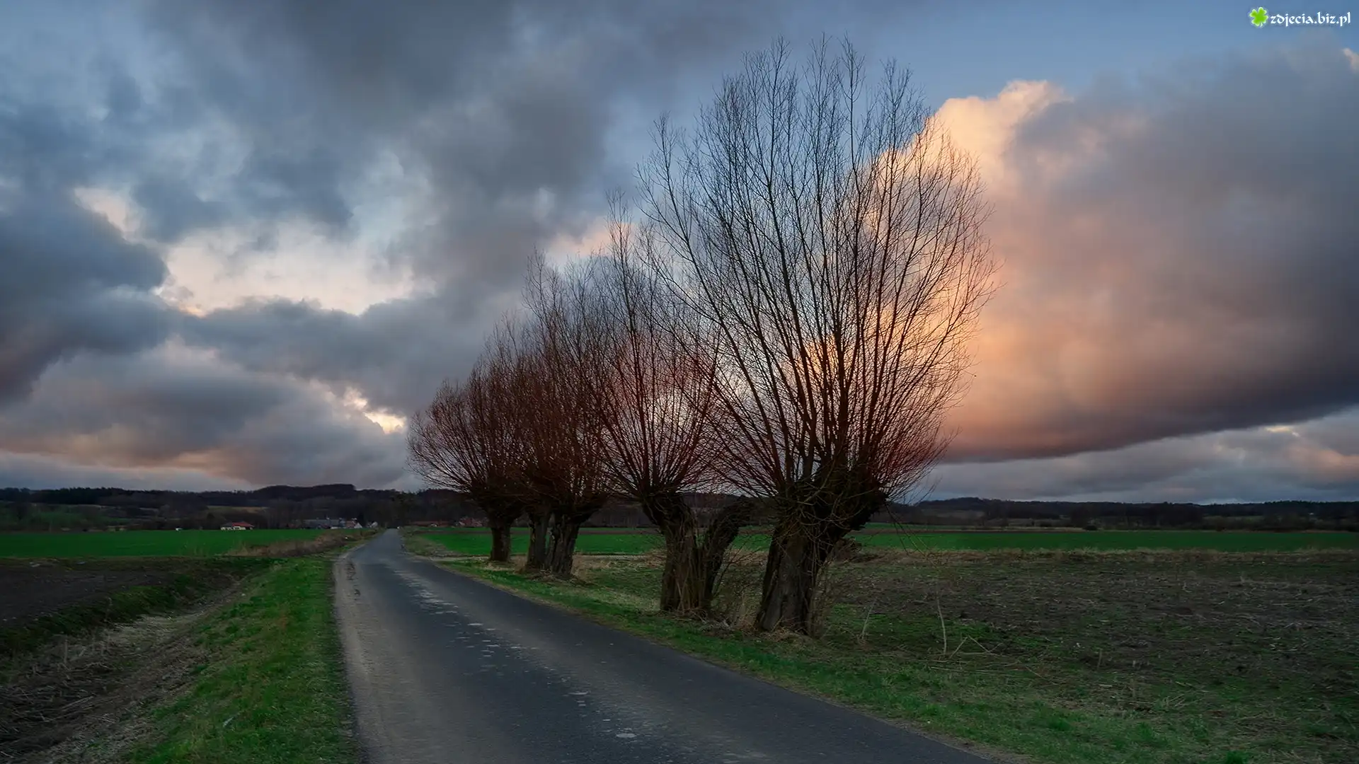Zdjęcie Pole, Droga, Drzewa, Wierzby, Niebo, Chmury