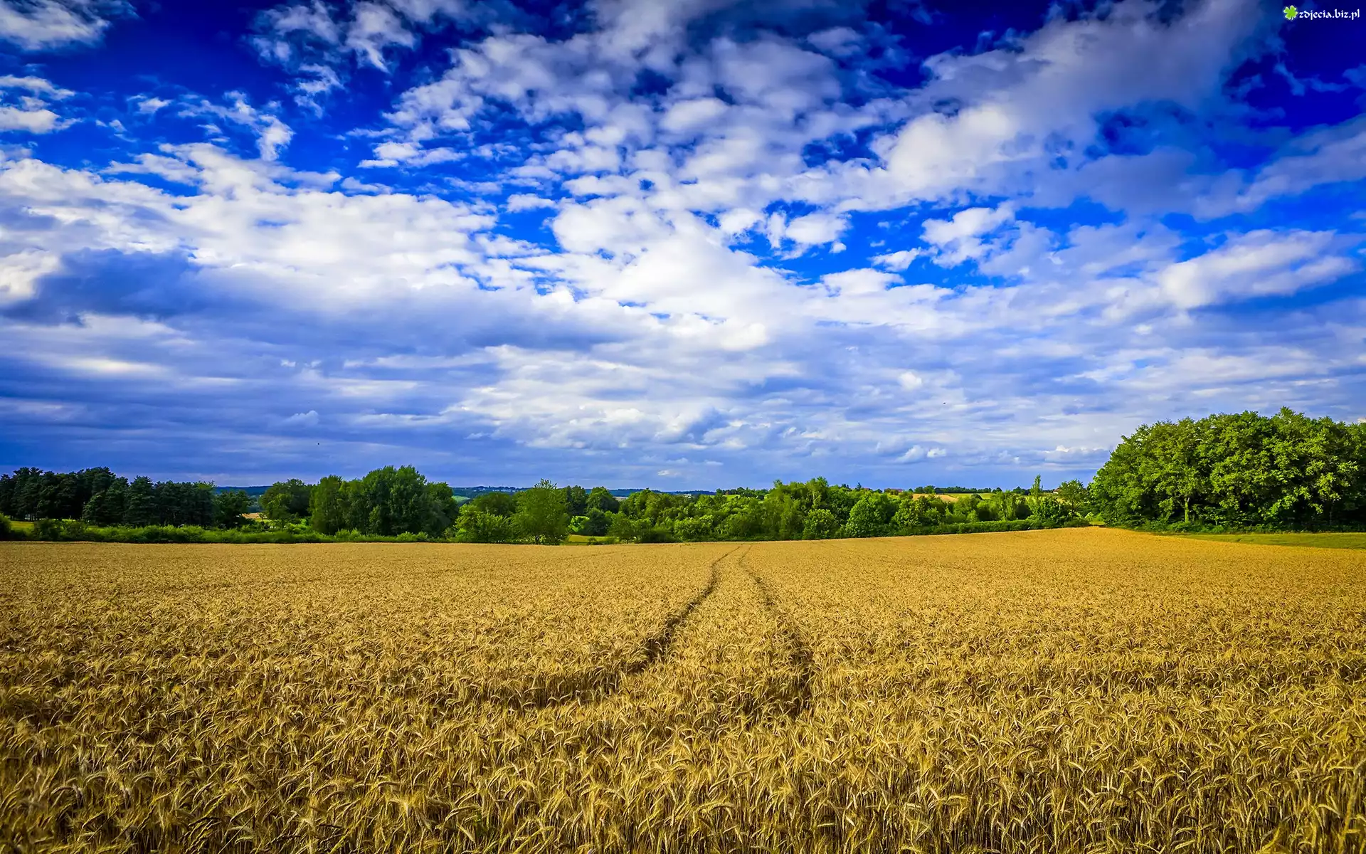 Zdjęcie Pole, Zboże, Drzewa, Niebo, Chmury