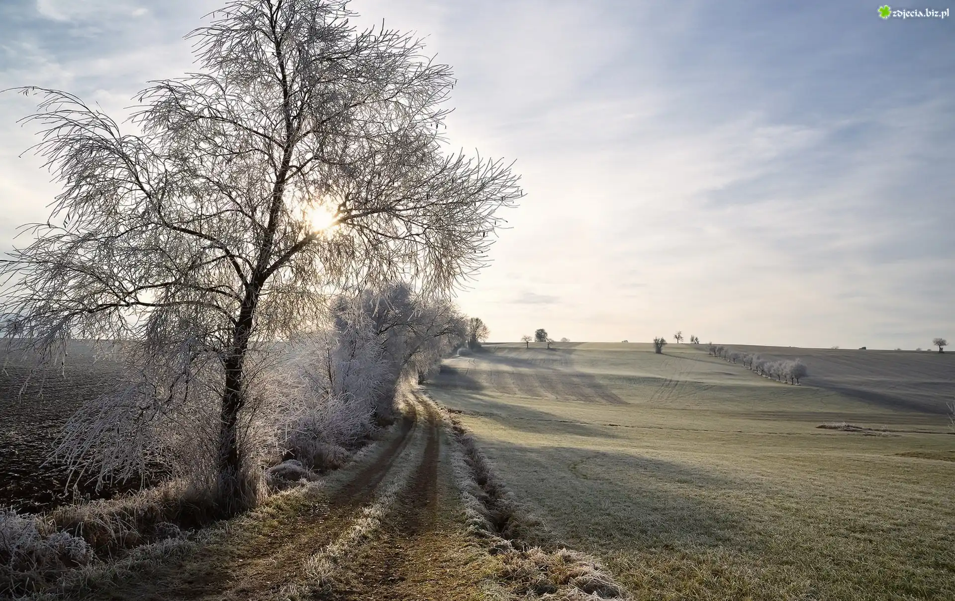 Zdjęcie Pole, Drzewa, Poranek, Szron