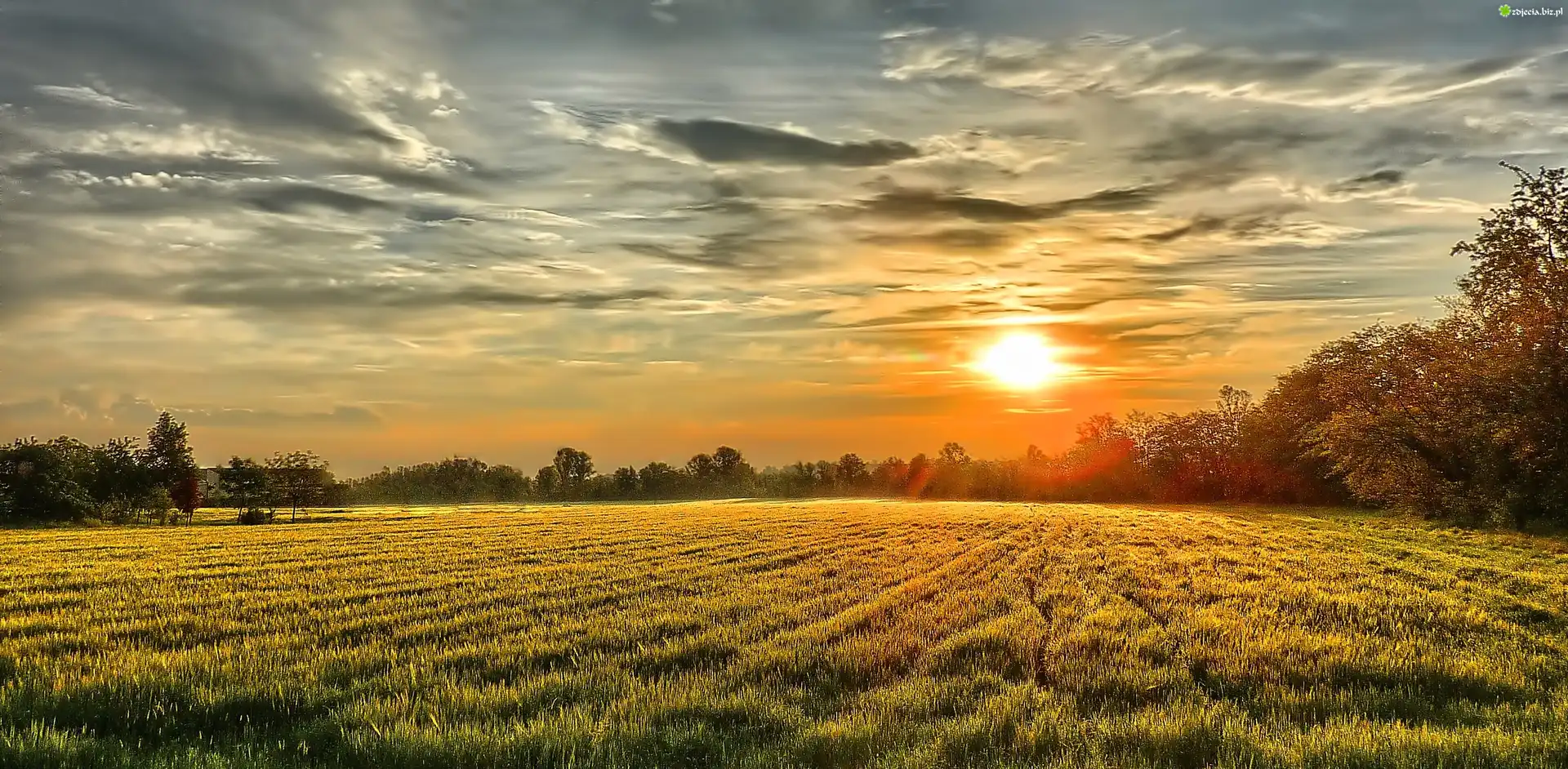Zdjęcie Pole, Zachód słońca, Drzewa