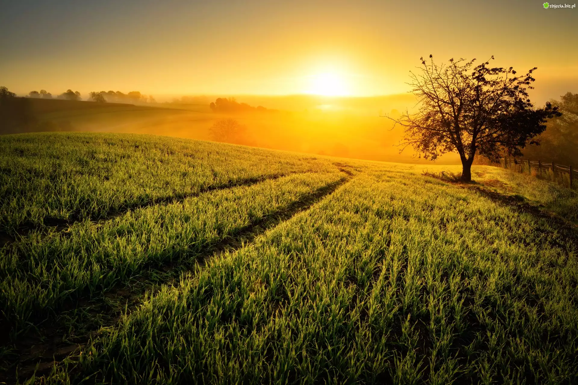 Zdjęcie, Pole, Zachód słońca, Drzewo