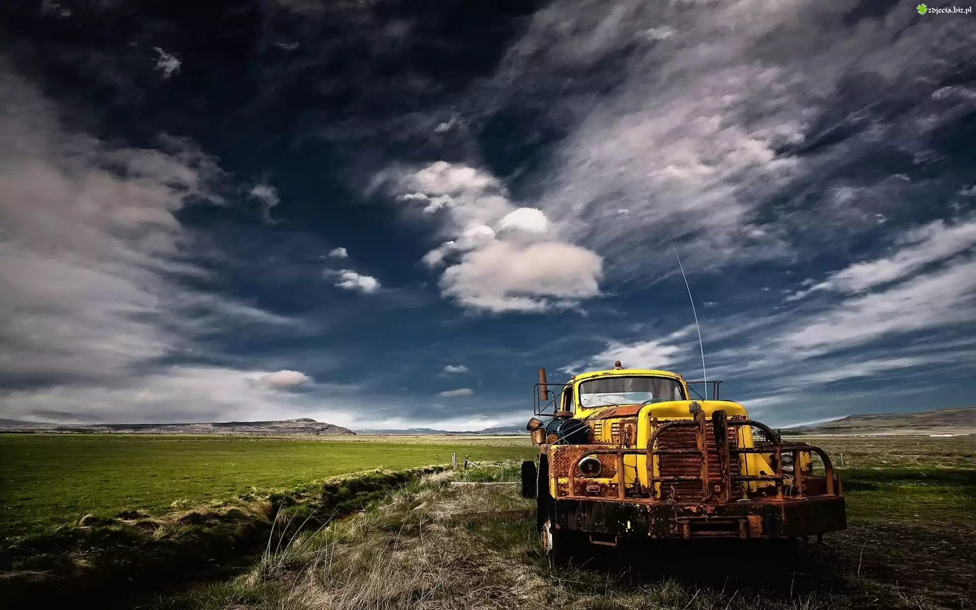 Zdjęcie, Pole, Ciężarówka, Trawa, Chmury