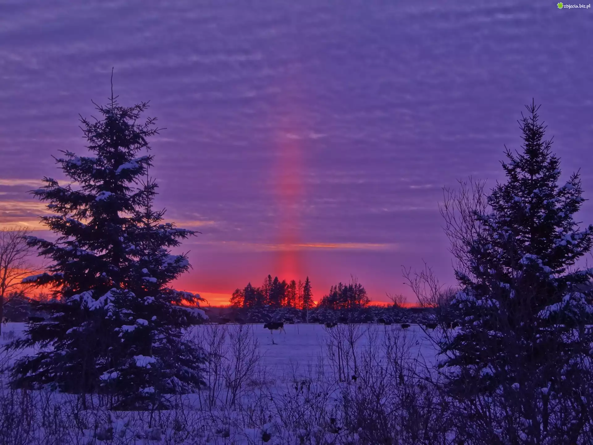 Zdjęcie Pole, Zachód, Słońca, Świerki, Śnieg