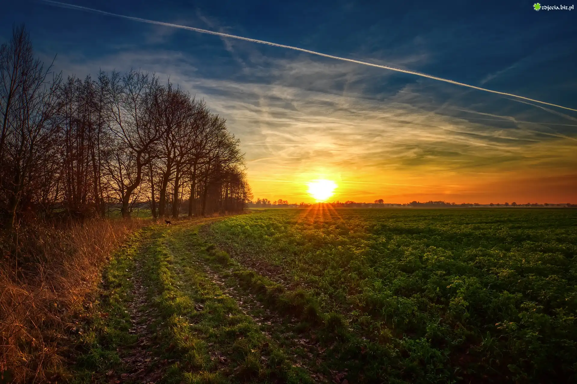 Zdjęcie Pole, Drzewa, Droga, Pies, Wschód słońca