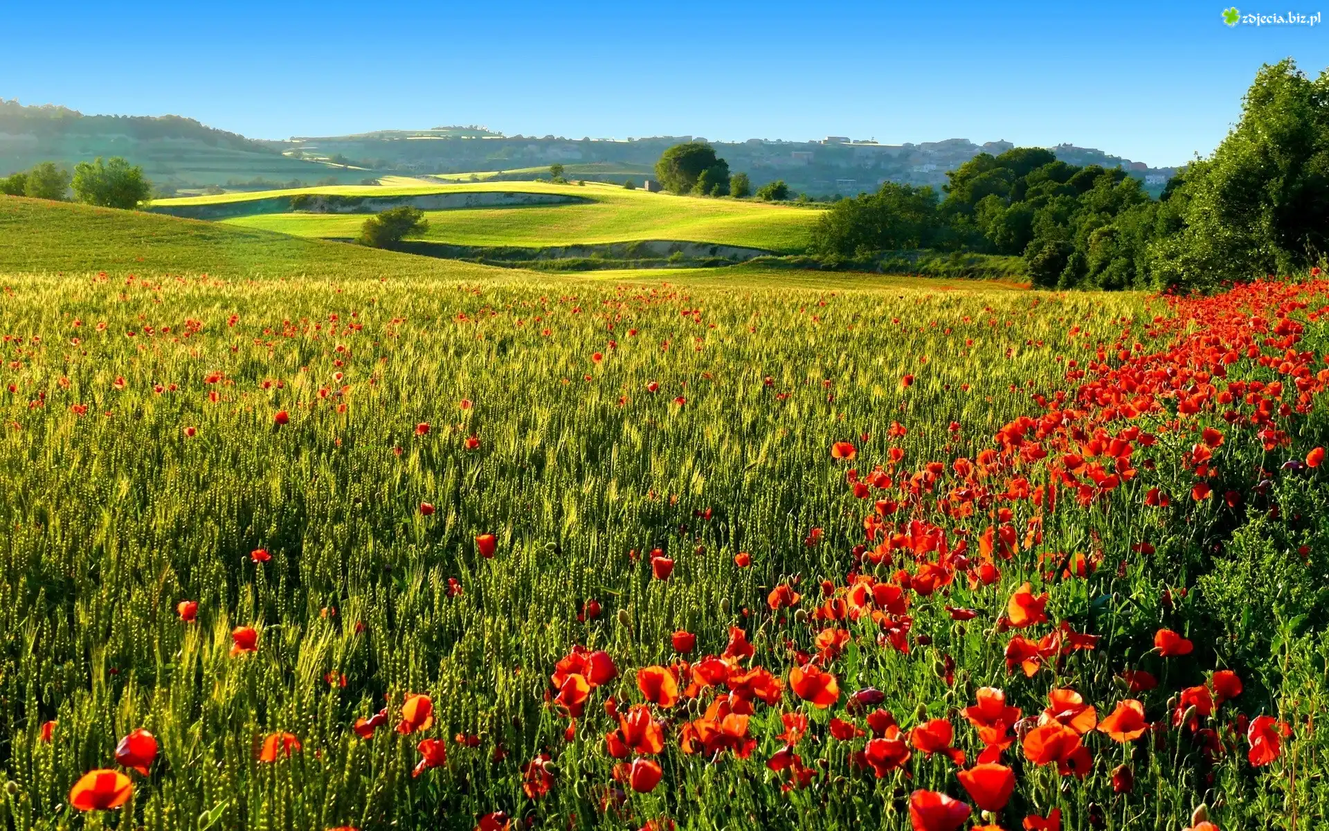 Zdjęcie Pole, Kłosy, Czerwone, Maki, Wzgórza, Drzewa
