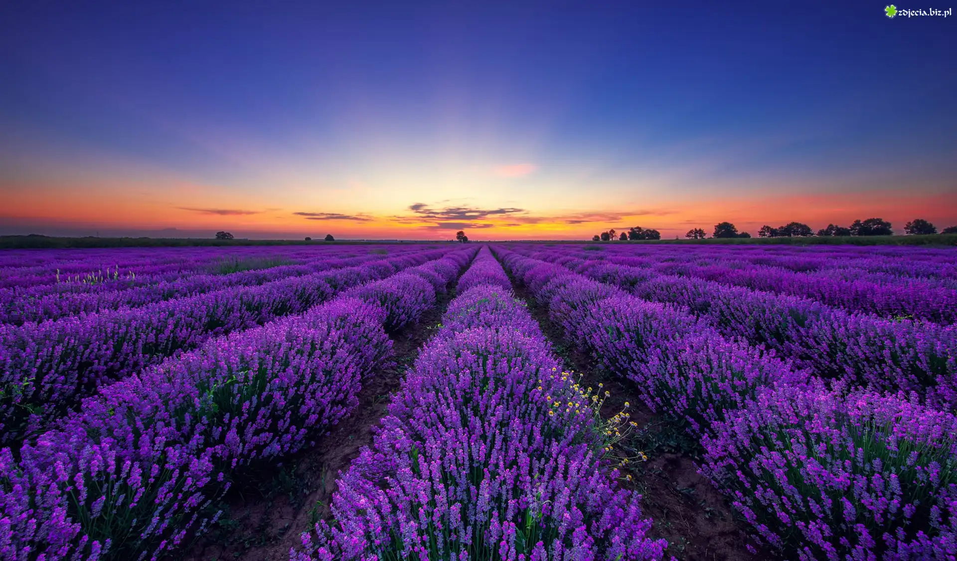 Zdjęcie Pole, Lawenda, Drzewa, Zachód słońca