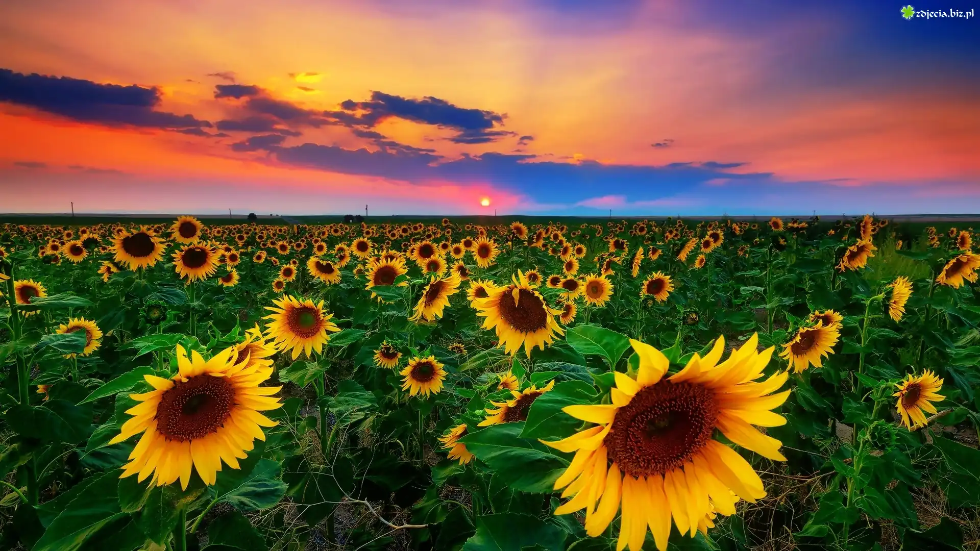 Zdjęcie Pole, Słoneczniki, Piękny, Zachód, Słońca