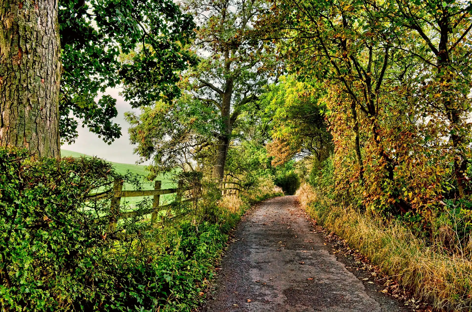 Zdjęcie, Polna, Droga, Drzewa, Ogrodzenie, Jesień