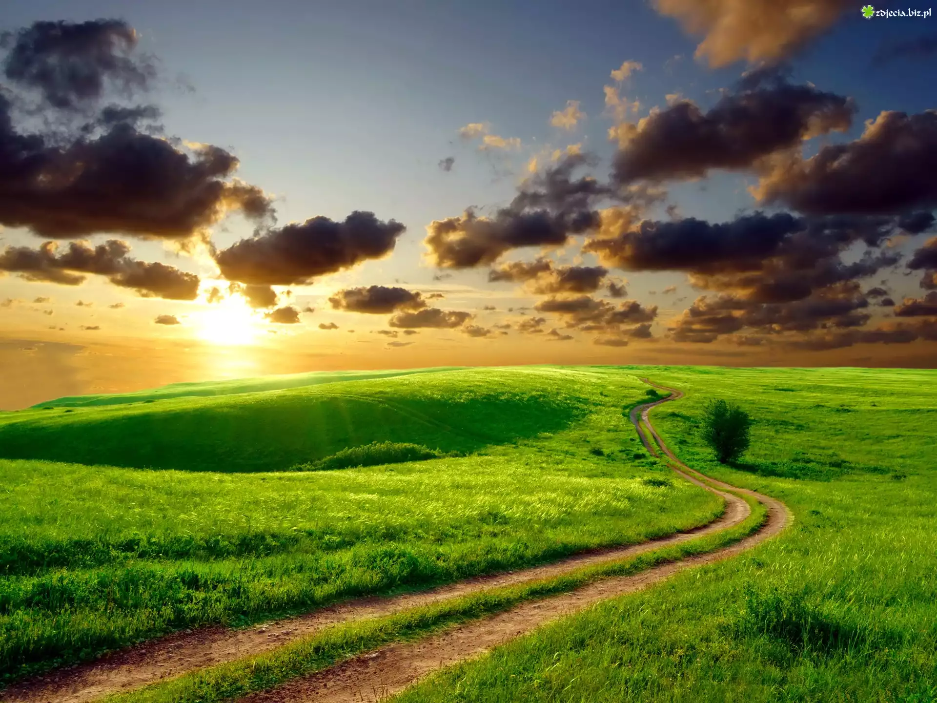 Zdjęcie Polna, Droga, Chmury, Zachodzące, Słońce