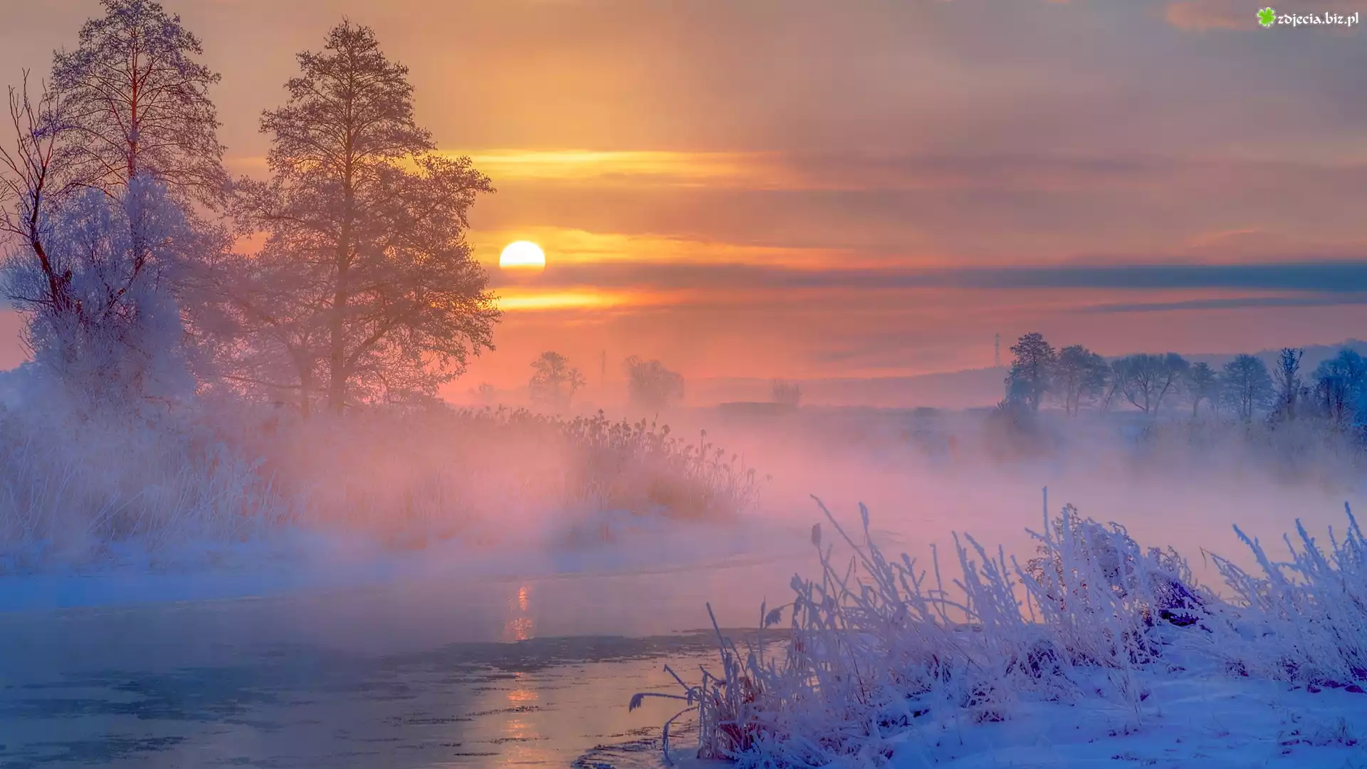Zdjęcie Zima, Rzeka Gwda, Śnieg, Drzewa, Krzewy, Mgła, Wschód słońca, Polska