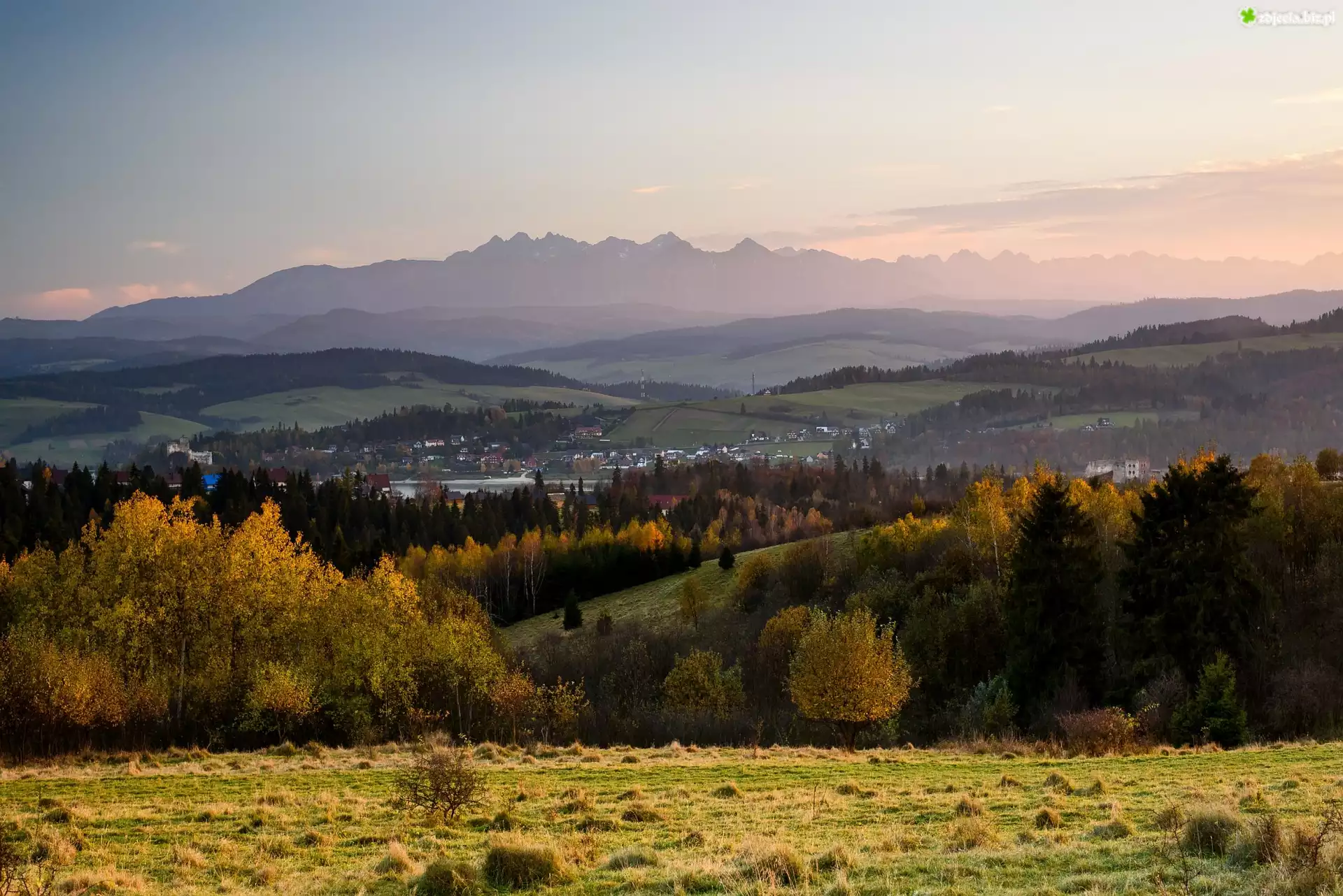 Zdjęcie, Góry, Drzewa, Domy, Kotlina Orawsko-Nowotarska, Czorsztyn, Województwo małopolskie, Polska