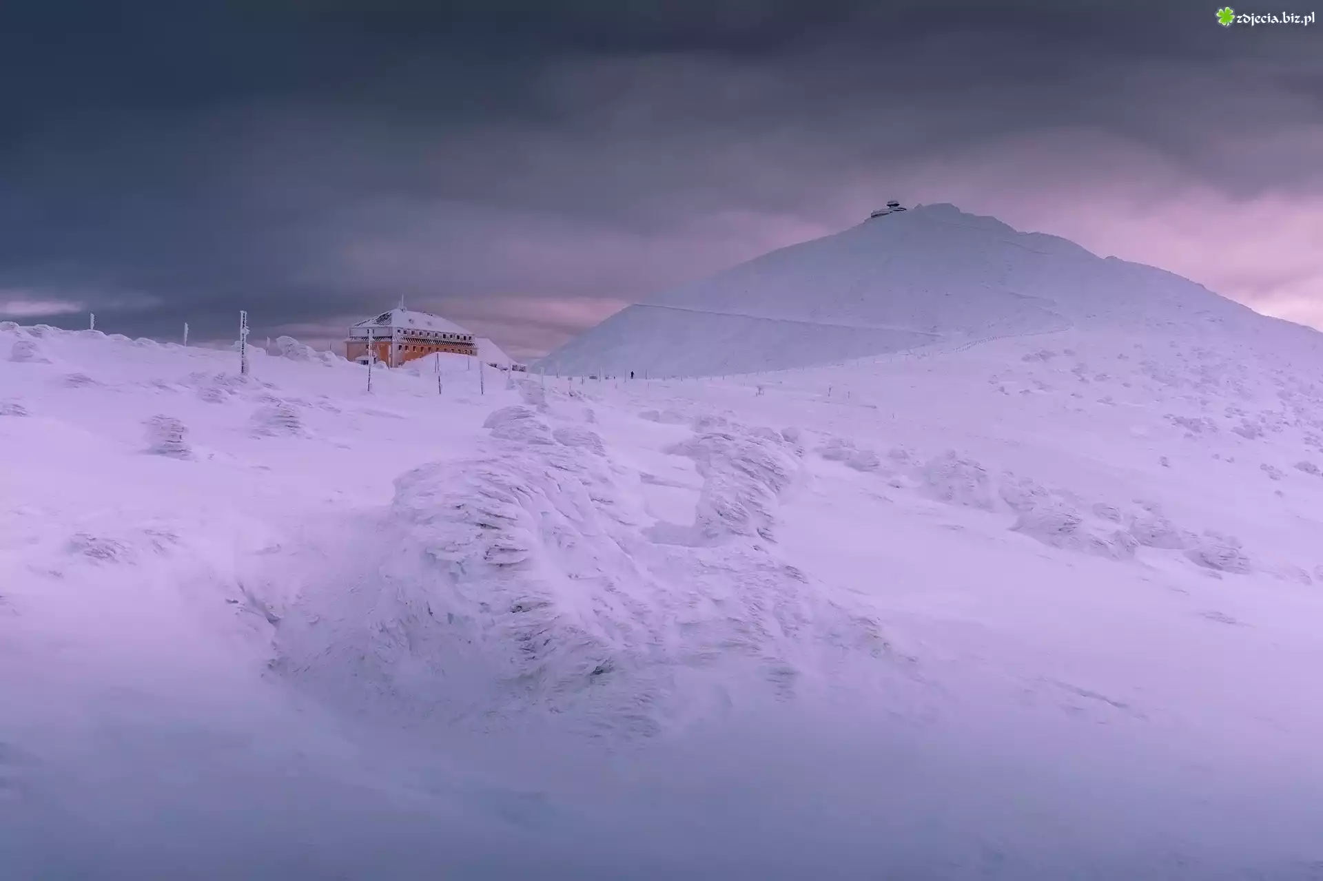 Zdjęcie Zima, Góry Sudety, Obserwatorium, Szczyt Śnieżka, Dom, Schronisko, Polska