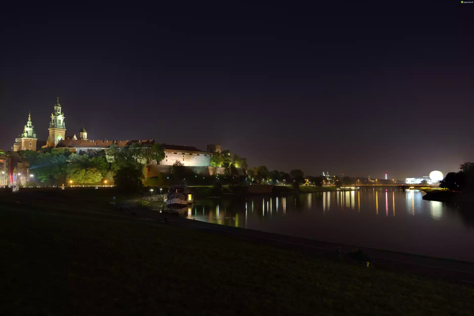 Zdjęcie, Polska, Kraków, Zamek Królewski na Wawelu, Wawel, Rzeka Wisła, Noc