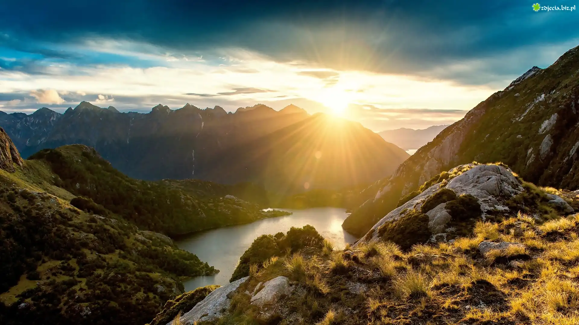 Zdjęcie Park Narodowy Fiordland, Wyspa Południowa, Nowa Zelandia, Góry, Jezioro, Wschód słońca, Promienie słońca, Chmury |