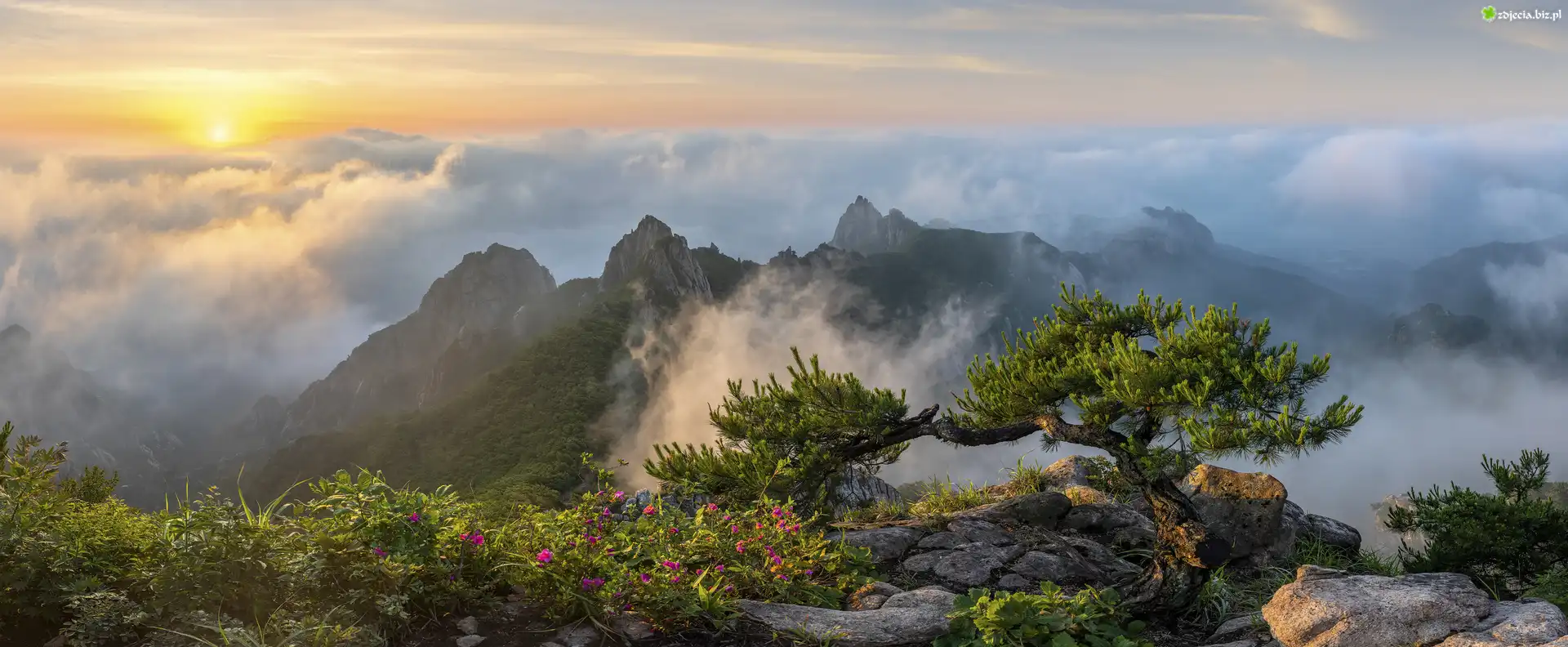 Zdjęcie Góry Wolchulsan, Skały, Sosna, Mgła, Wschód słońca, Korea Południowa