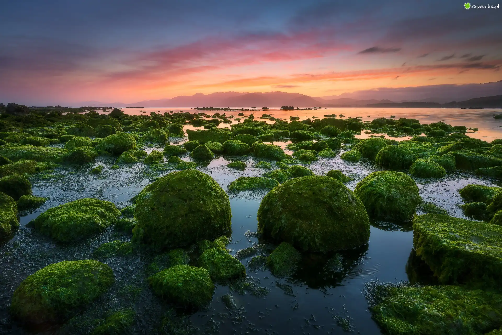 Zdjęcie Kaikoura, Wyspa Południowa, Nowa Zelandia, Brzeg, Morze, Kamienie, Wodorosty, Zachód Słońca |