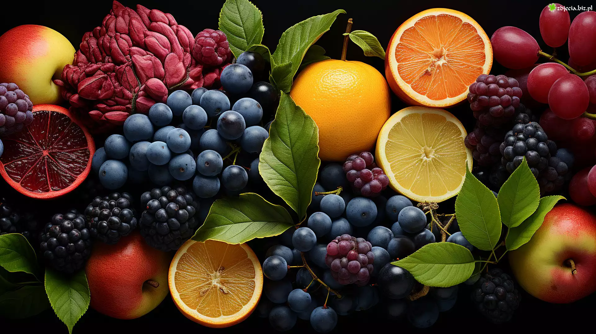 Zdjęcie, Owoce, Winogrona, Jeżyny, Pomarańcza, Cytryny, Jabłka