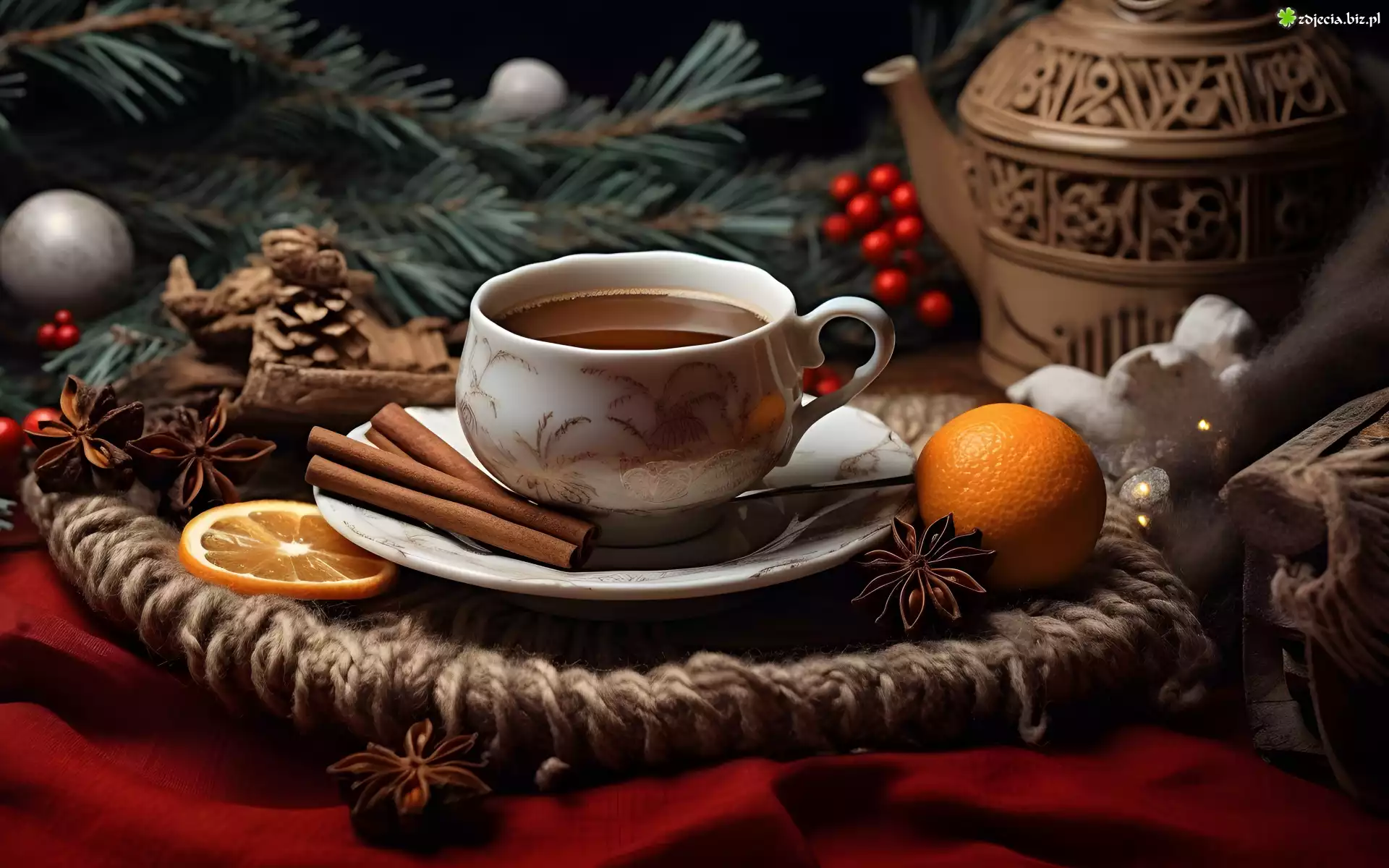 Zdjęcie Filiżanka, Herbata, Cynamon, Pomarańcze, Stroik, Gałązki