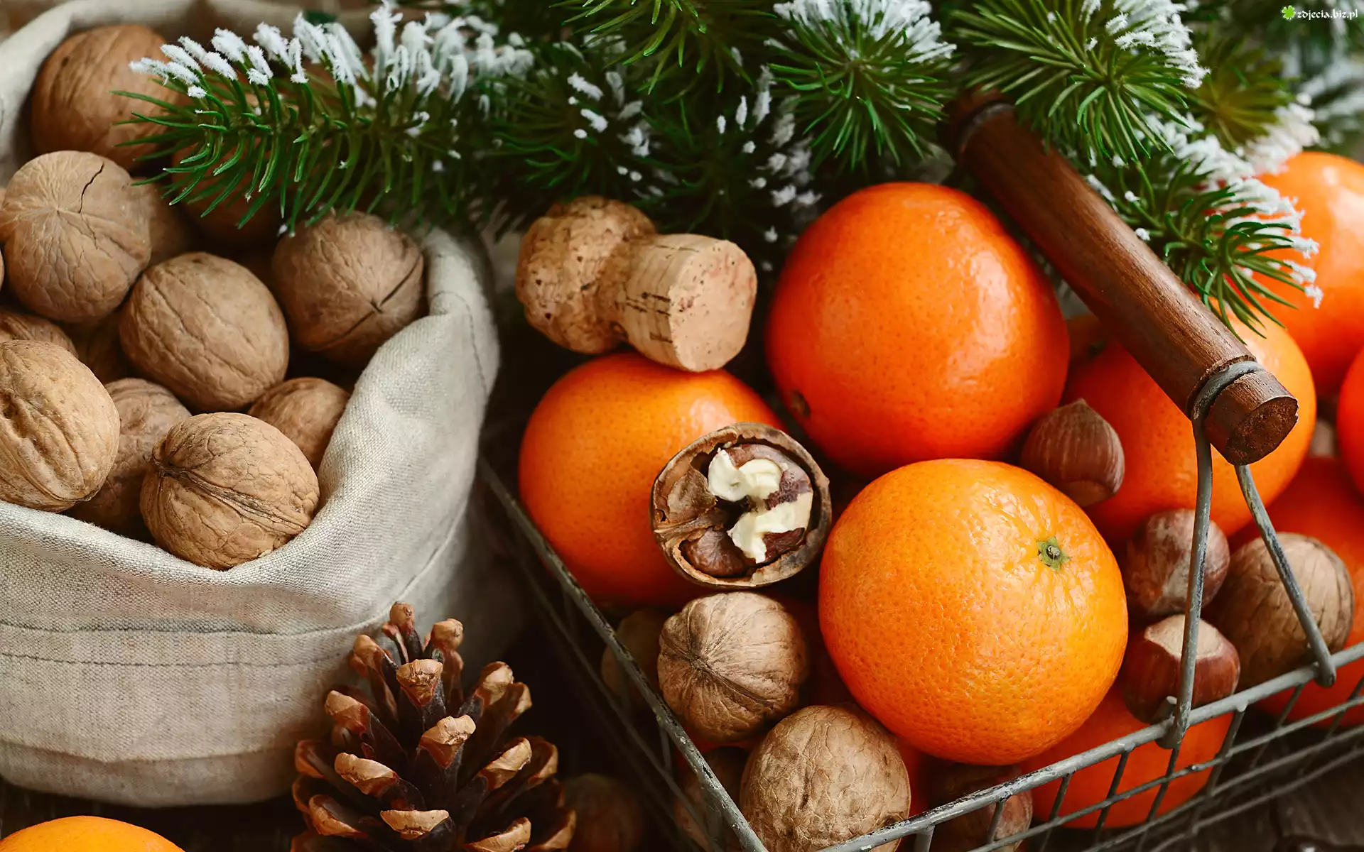 Zdjęcie, Pomarańcze, Orzechy włoskie, Koszyk, Gałązki, Worek