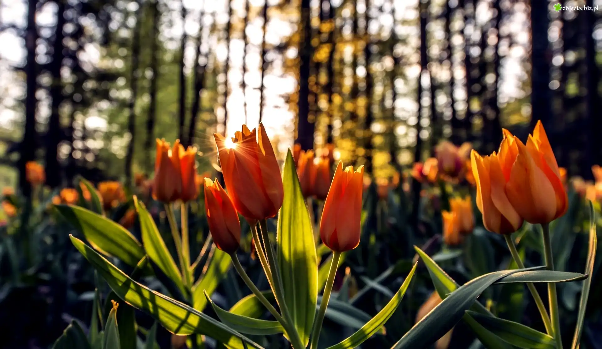 Zdjęcie Pomarańczowe, Tulipany, Promienie Słońca, Las