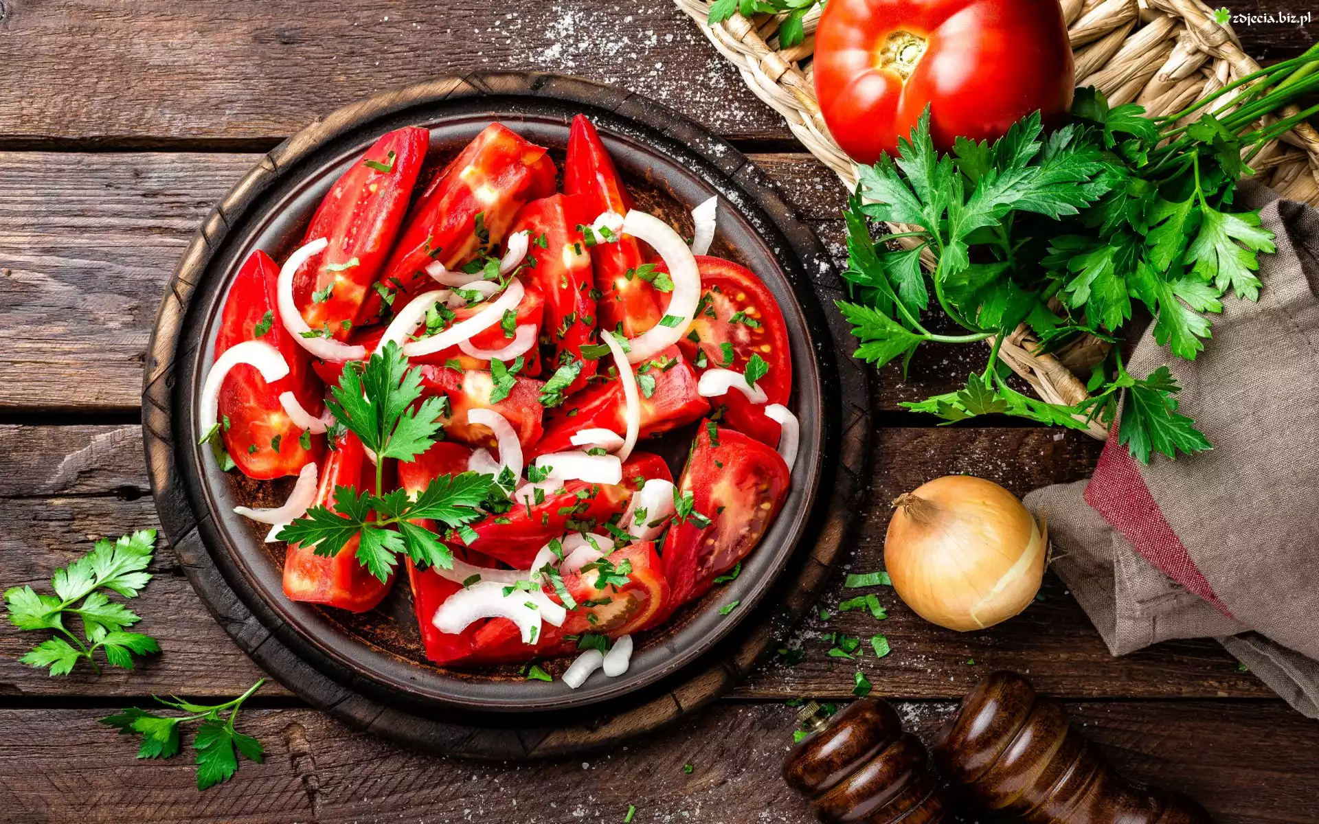 Zdjęcie Pomidory, Talerz, Cebula, Pietruszka