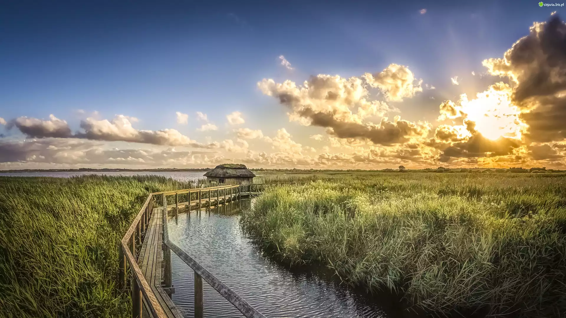 Zdjęcie Pomost, Trawa, Jezioro, Chmury, Domek