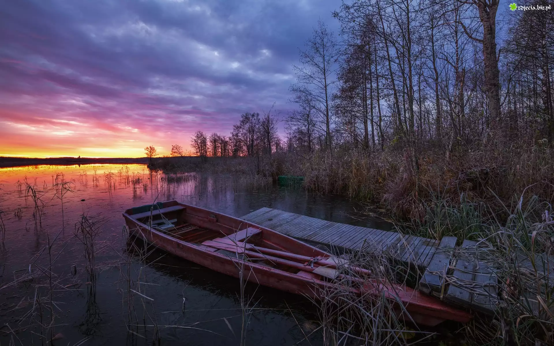Zdjęcie Jezioro, Łódka, Szuwary, Pomost, Drzewa, Zachód słońca