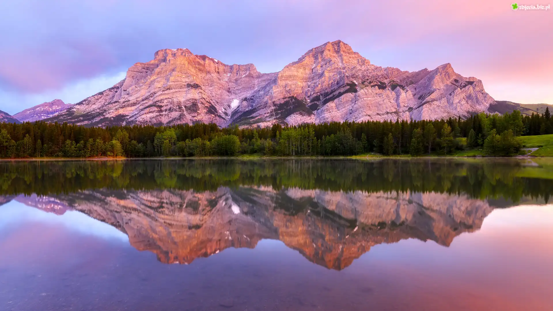 Zdjęcie Góry Canadian Rockies, Jezioro Wedge Pond, Drzewa, Odbicie, Park Kananaskis, Alberta, Kanada |