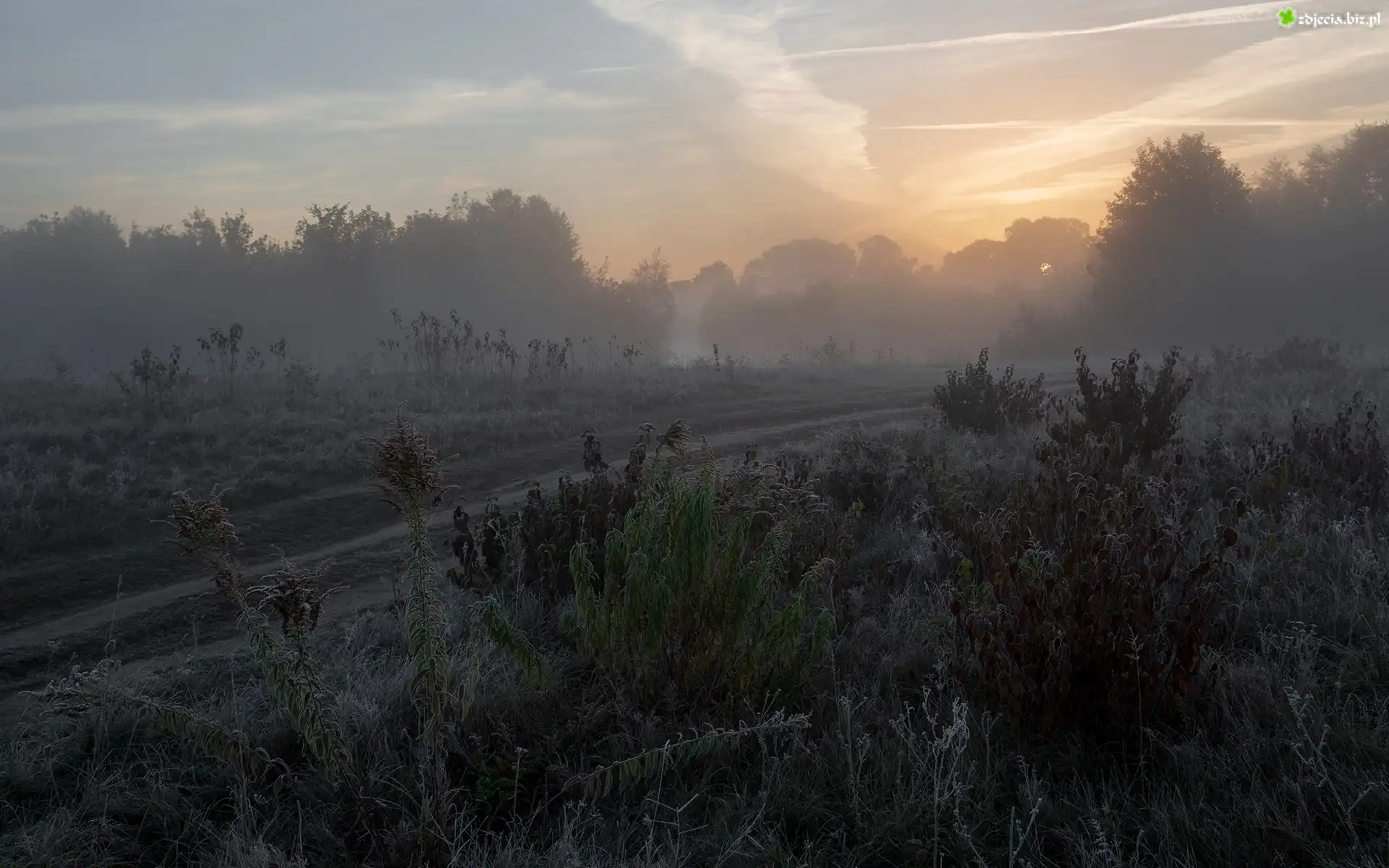 Zdjęcie Poranek, Mgła, Droga, Rośliny, Szron, Drzewa