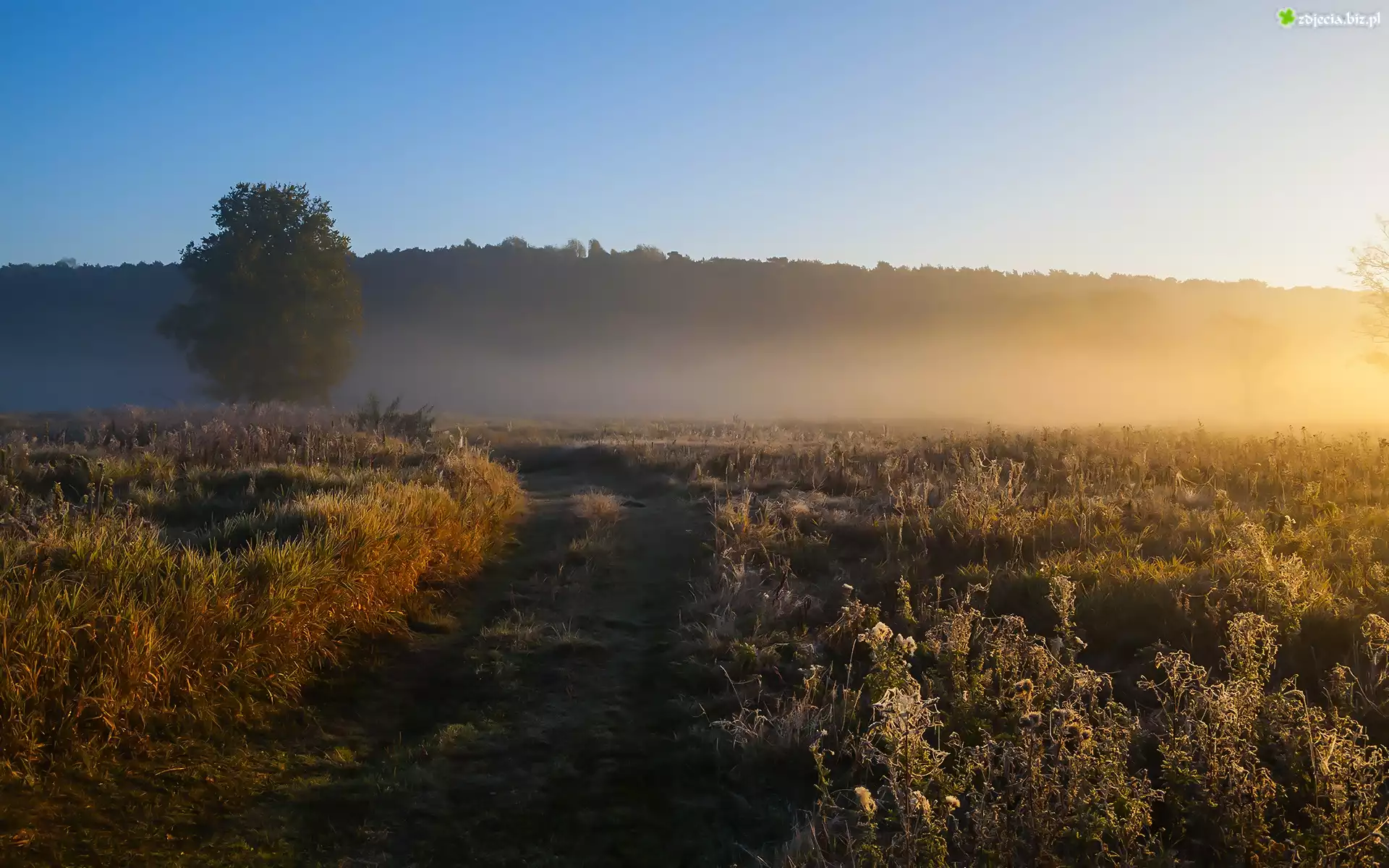 Zdjęcie, Mgła o poranku, Drzewo, Poranek, Mgła, Droga, Wschód słońca, Rogalin.