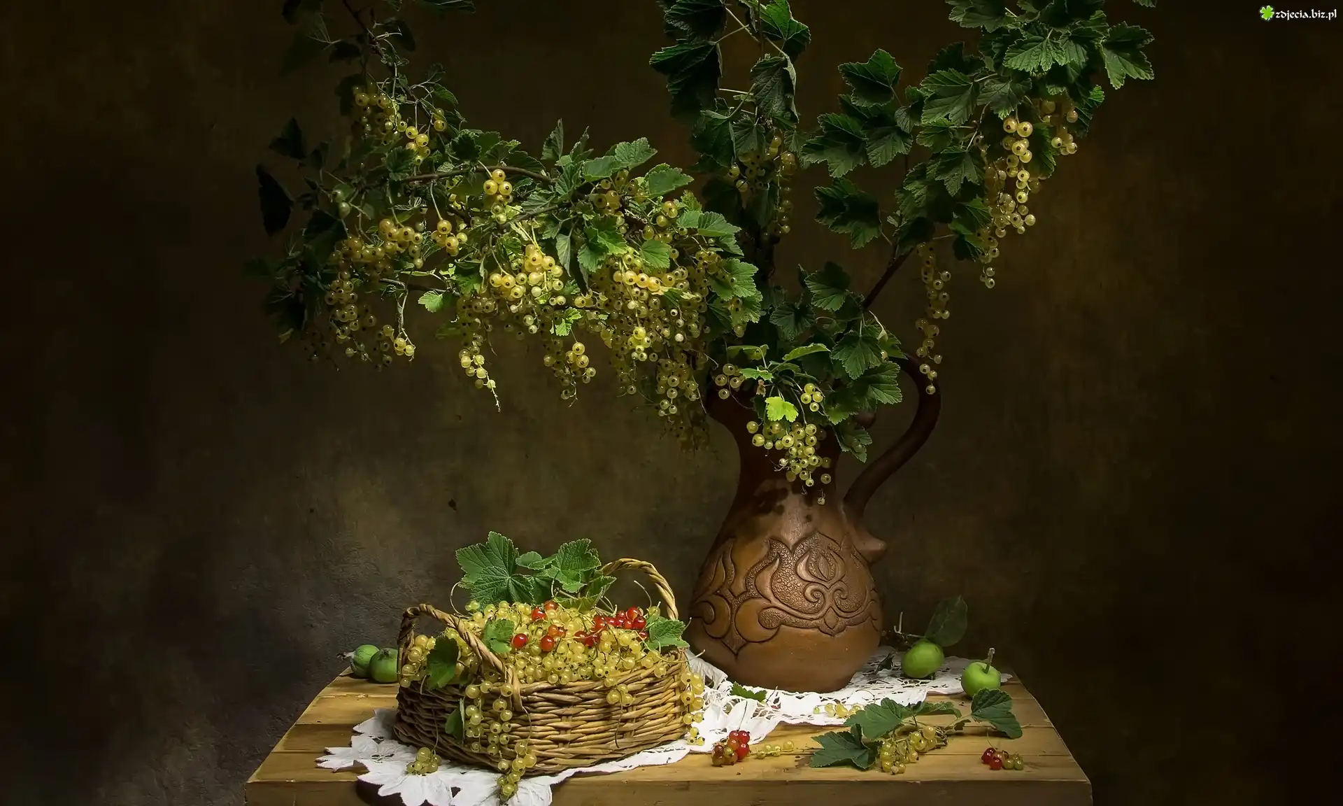 Zdjęcie, Porzeczki, Wazon, Stolik, Serweta, Koszyczek, Jabłka