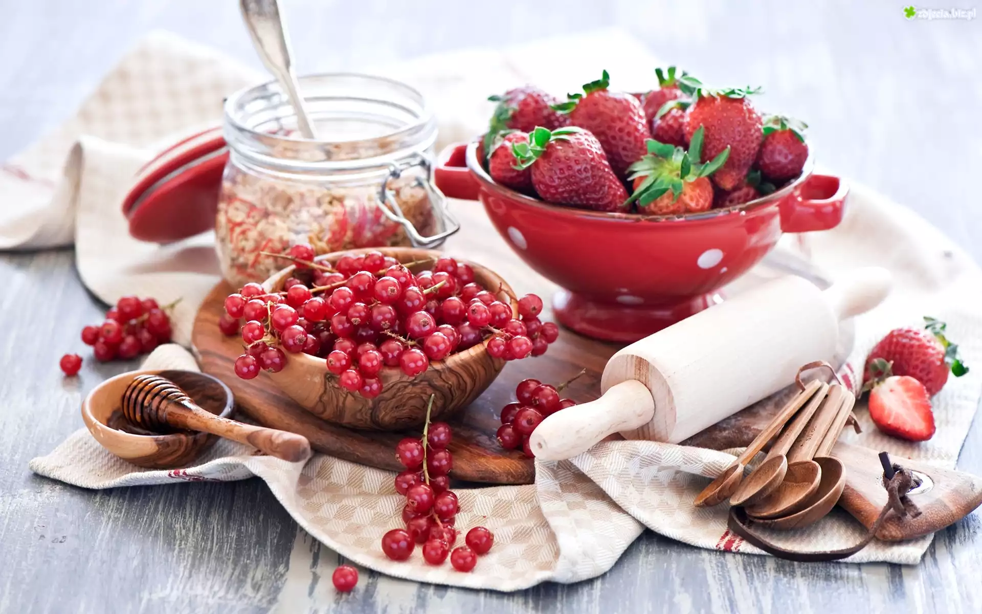 Zdjęcie Porzeczki, Truskawki, Łyżki, Wałek, Miód