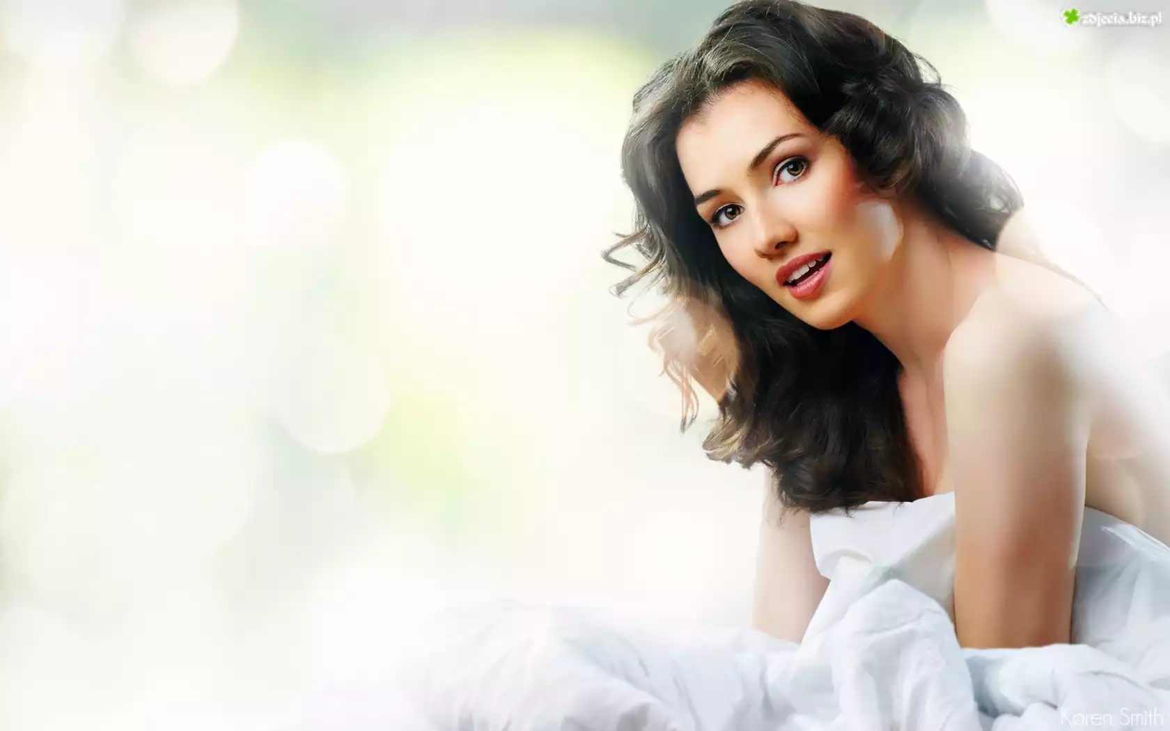 Zdjęcie Brunetka, Pościel, Uśmiech