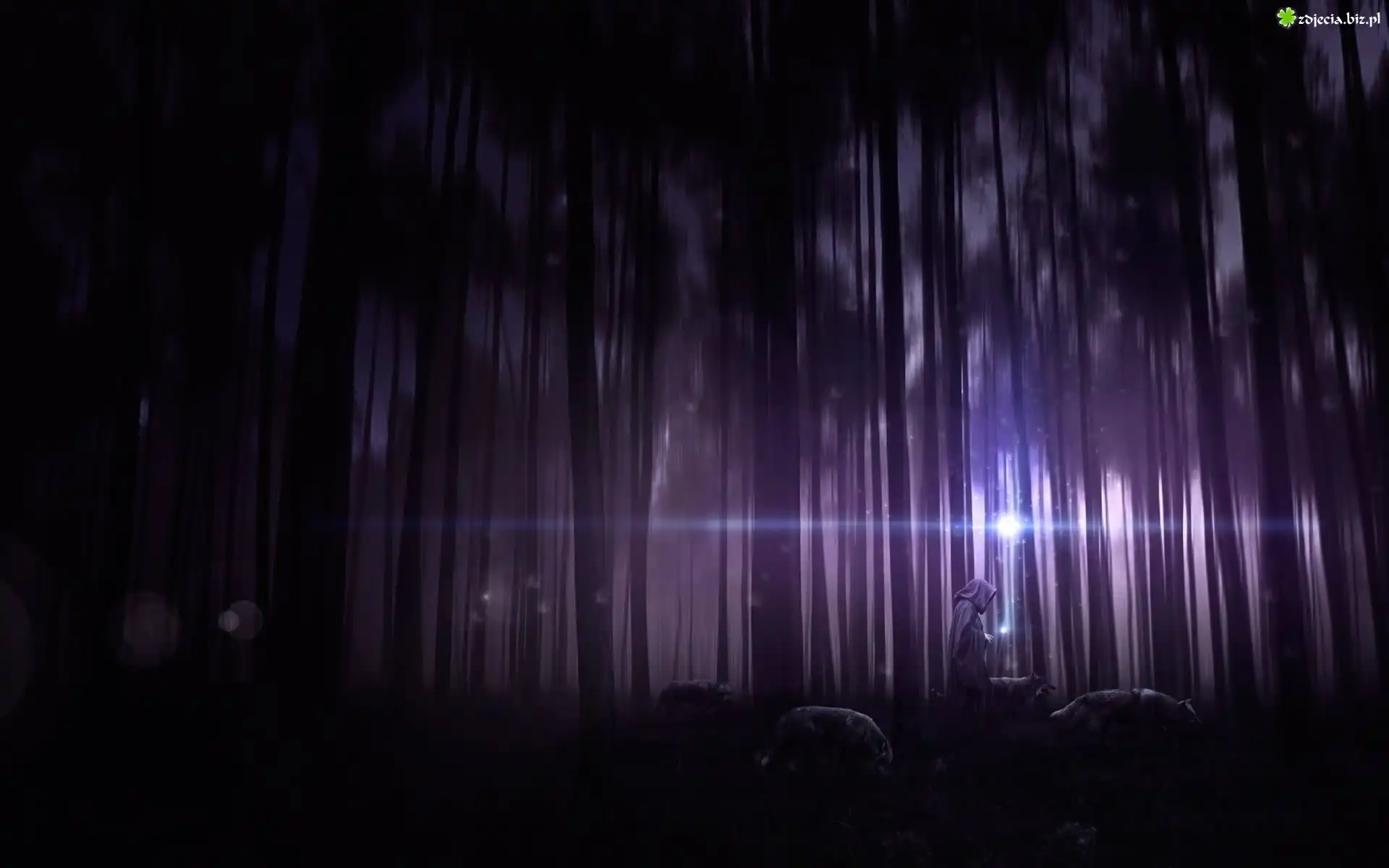 Zdjęcie Las, Postać, Zakapturzona, Zwierzęta, Wilki, Światło, Blask