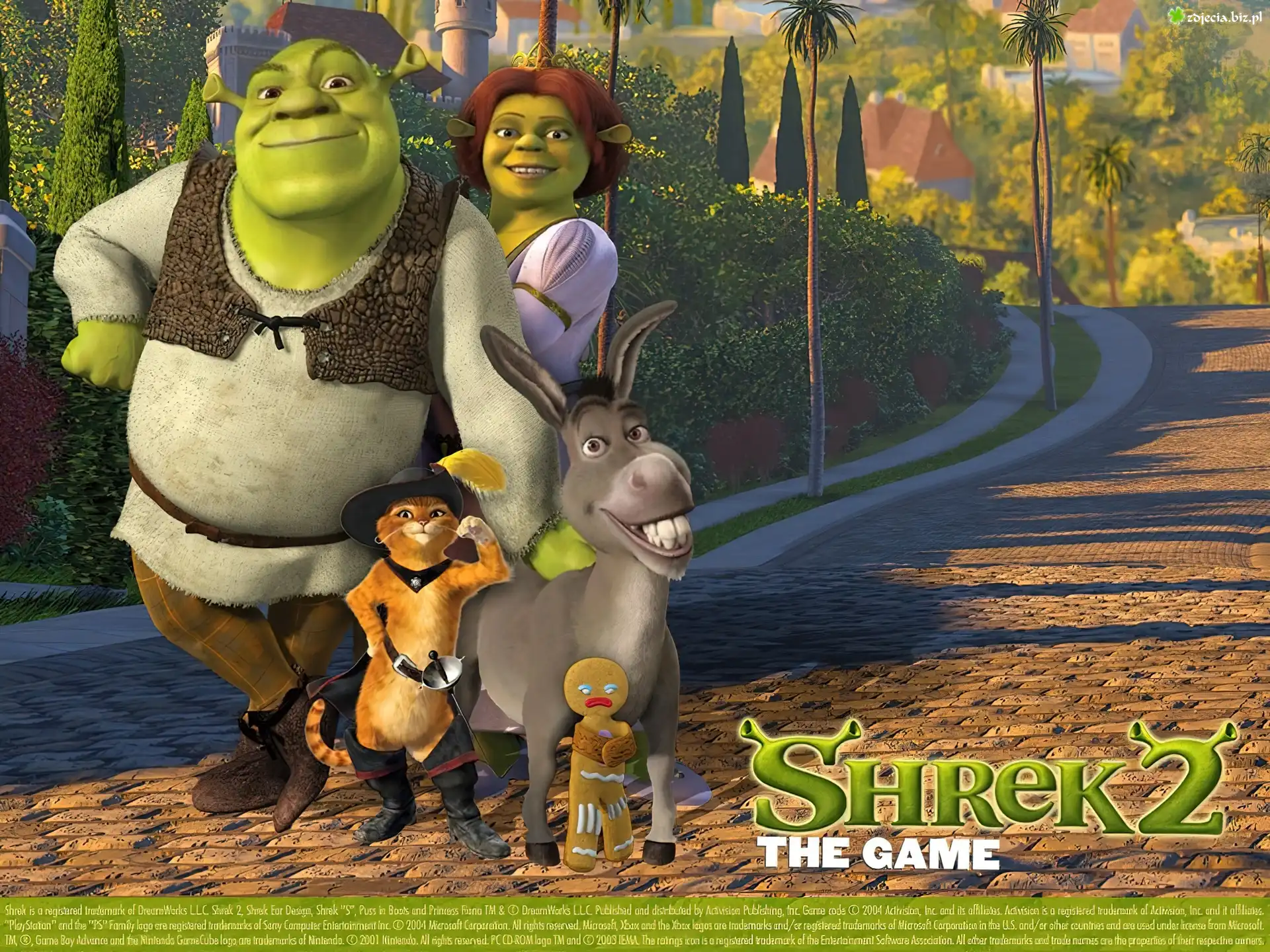 Shrek 2, uśmiechnięty, osioł postacie, droga, Shrek 2 Wróżka, Chrzestna, Shrek 2 Shrek, Fiona, osioł Shrek 2, Karoca ciastek, Shrek 2 Kot w butach, Shrek 2 Król Harold, Shrek 2