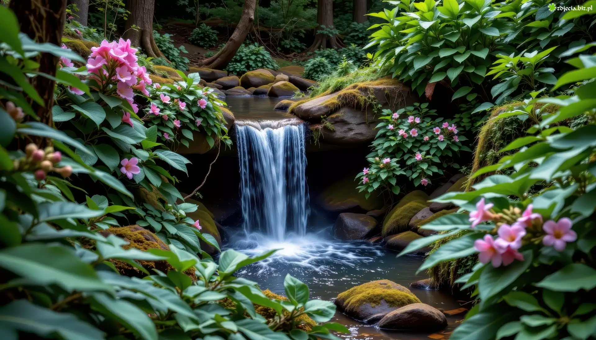 Zdjęcie Las, Potok, Kamienie, Kwiaty, Roślinność