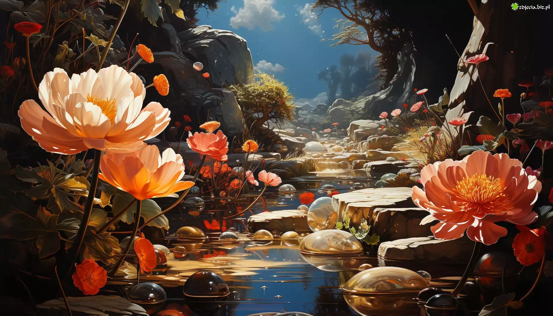Zdjęcie Kwiaty, Kolorowe, Grafika, Potok, Kamienie, Skały