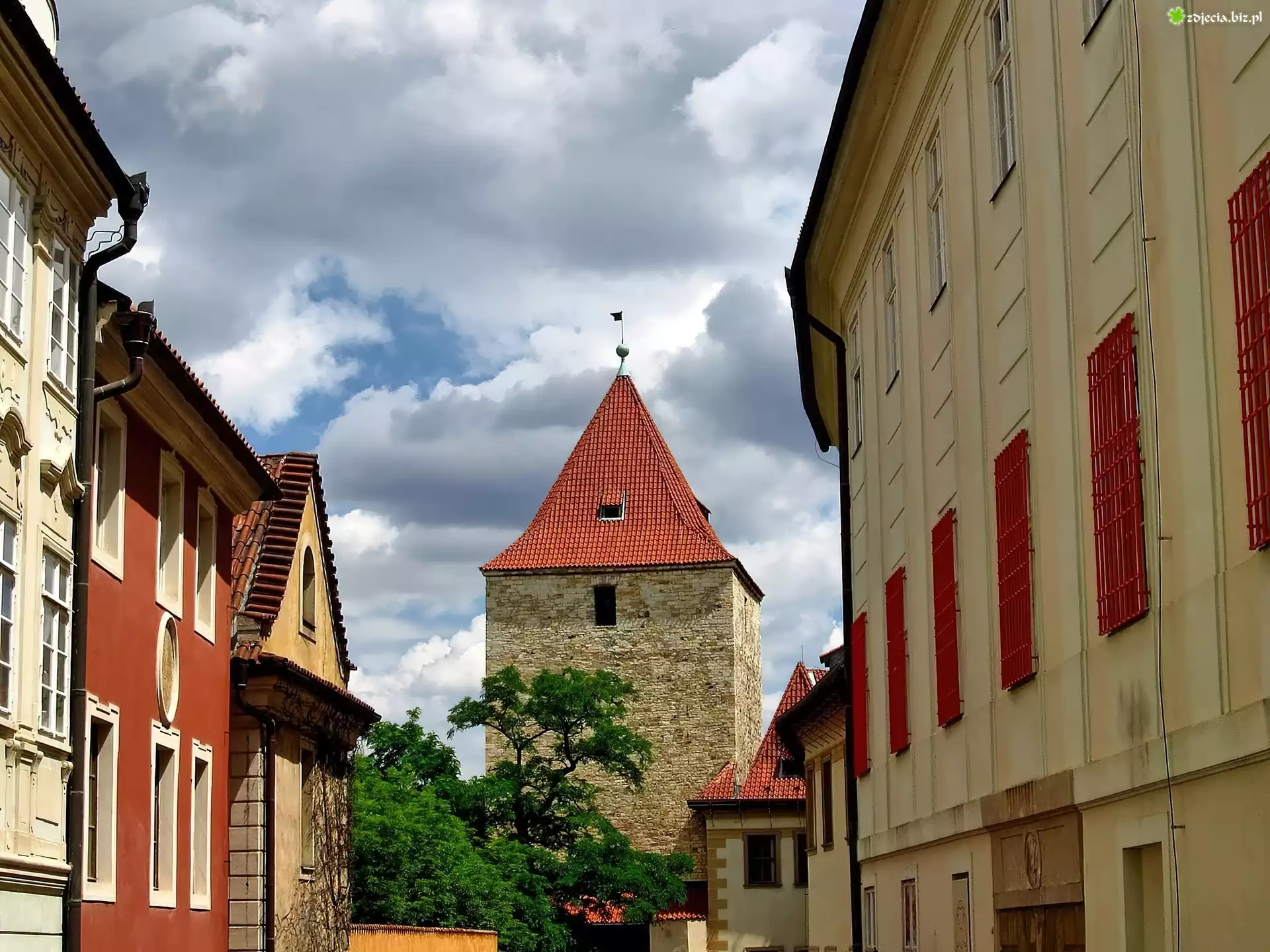 Zdjęcie Praga, Zabytki, Domy, Ulica, Akacja, Chmury
