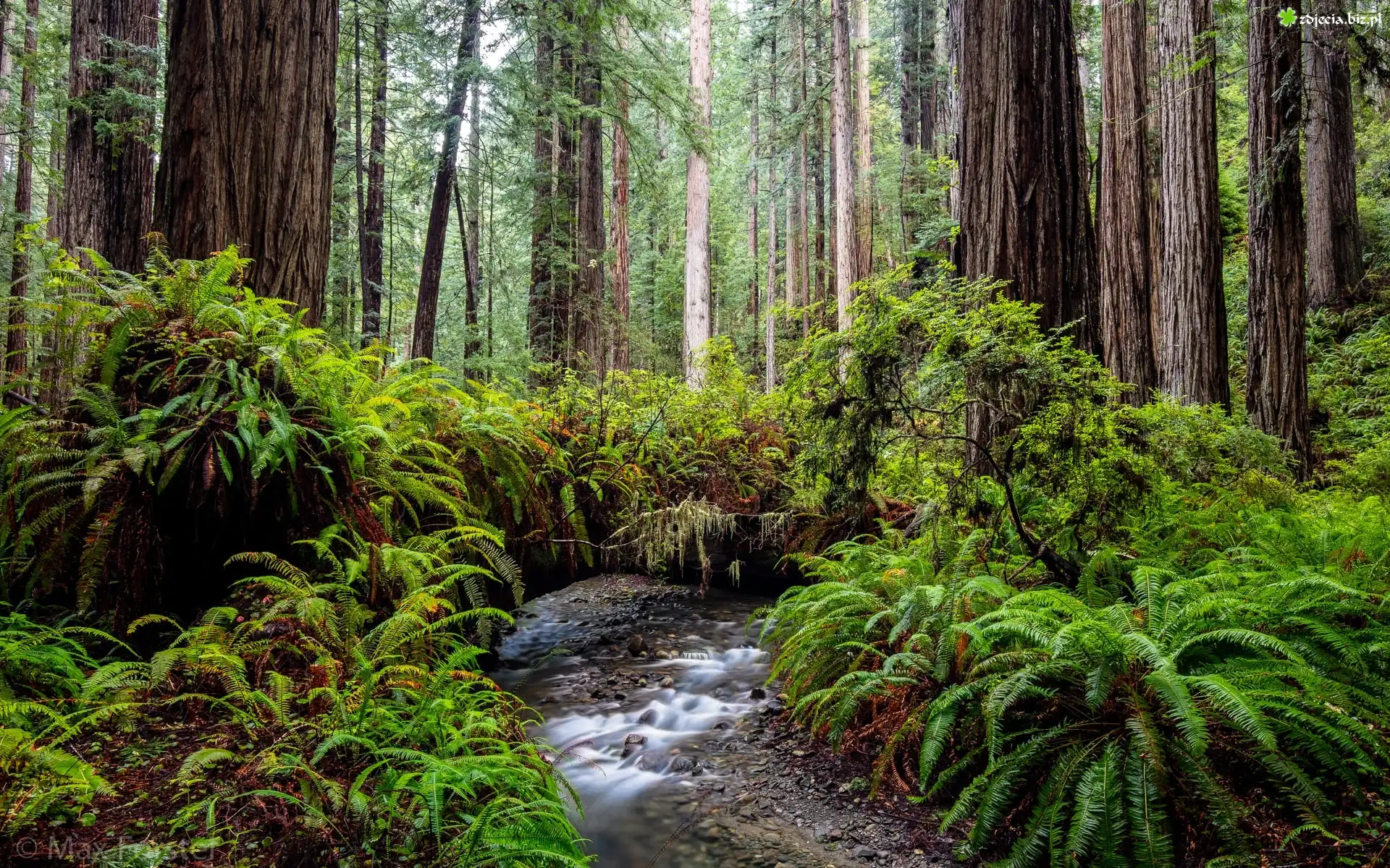 Zdjęcie Las, Drzewa, Sekwoje, Paprocie, Park stanowy, Rzeka, Prairie Creek Redwood State Park, Kalifornia, Stany Zjednoczone |