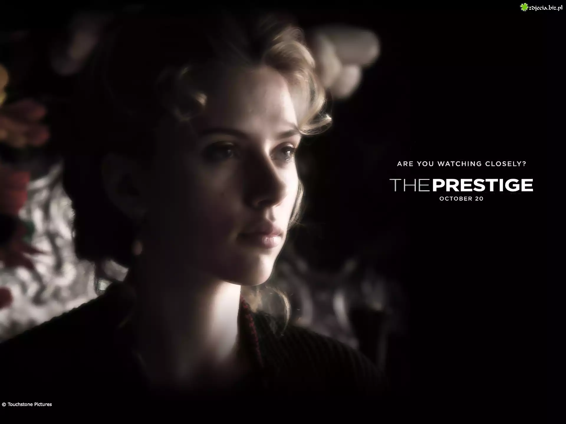 Zdjęcie The Prestige, Scarlett Johansson, twarz, loki, napis