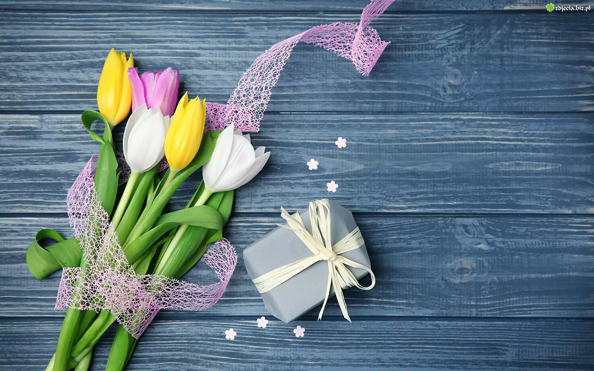 Zdjęcie Bukiet, Kolorowe, Tulipany, Prezent, Kokardka, Deski