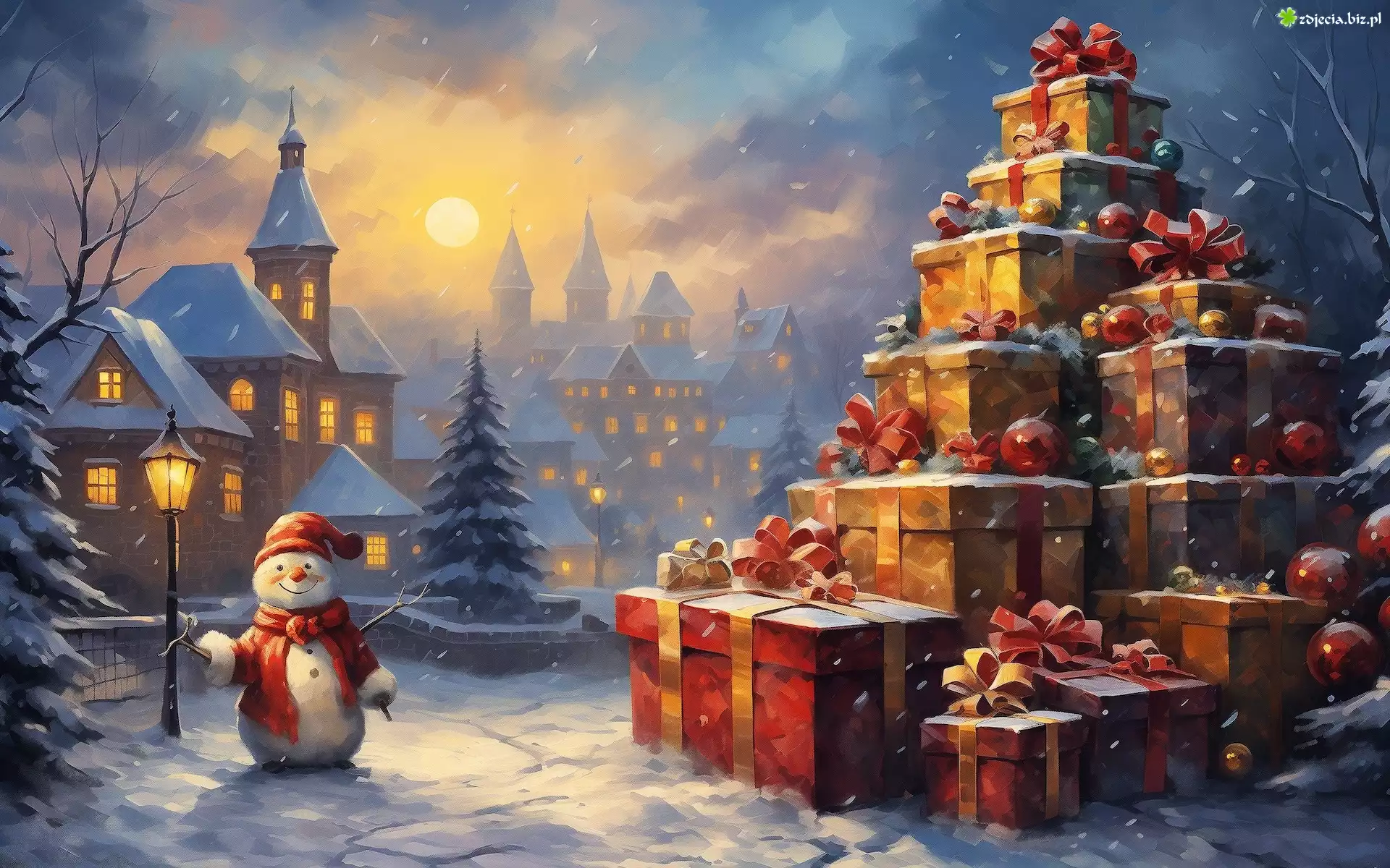 Zdjęcie Boże Narodzenie, Bałwan, Prezenty, Domy, Choinka, Księżyc